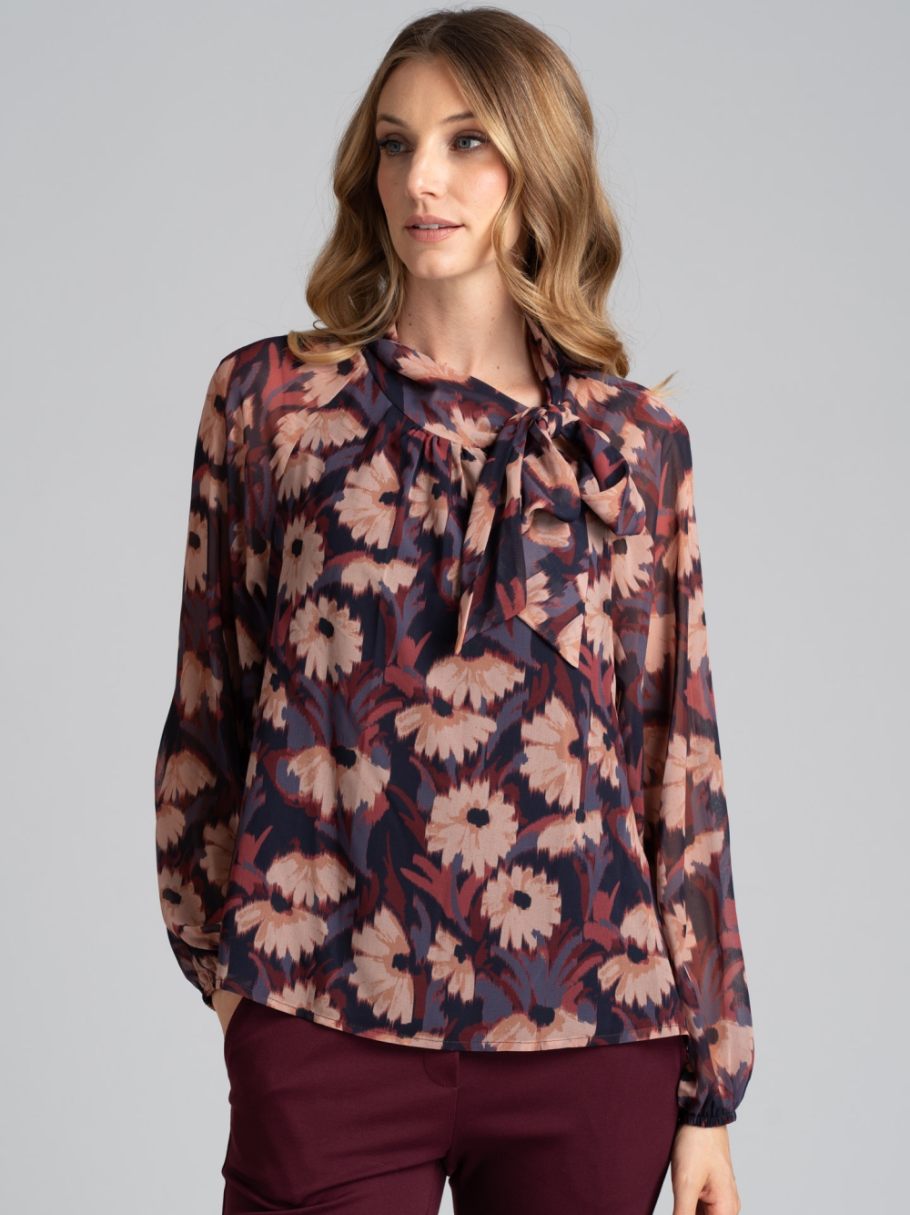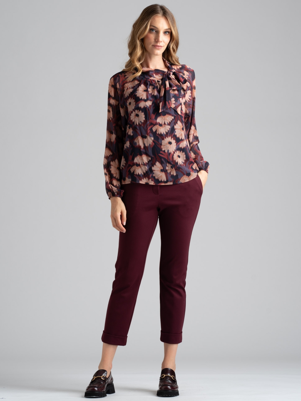 La camicia donna in tessuto doppia georgette fantasia cammello e bordeaux esclusiva INVIDIA 1973, presenta maniche a sbuffo con elastico al polso, fiocco laterale al collo e maniche lunghe.