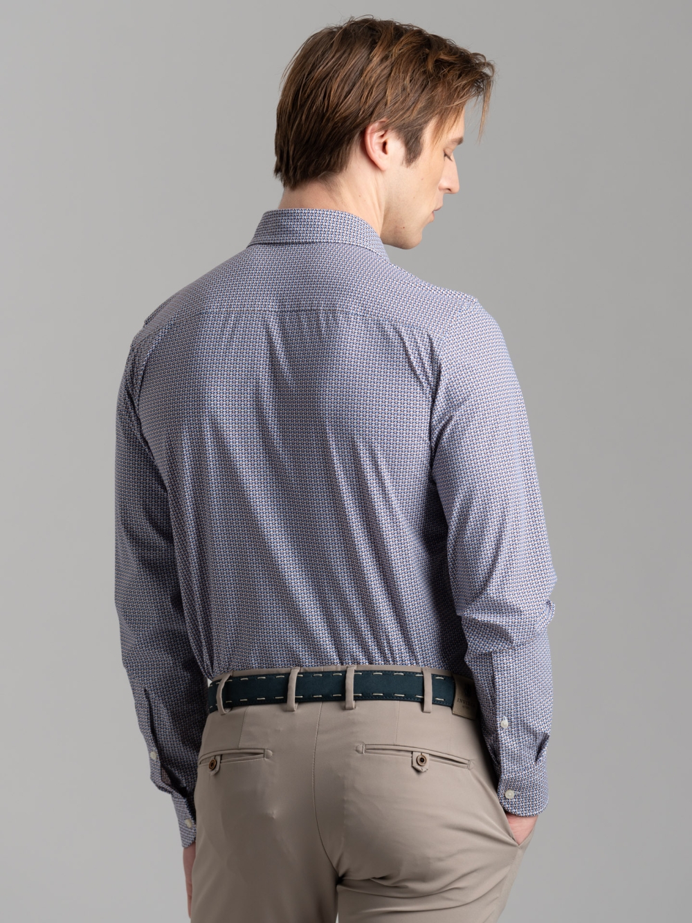 Camicia uomo realizzata in tessuto tecnico stampato con fantasia micro geometrica nei toni del blu, avio e bianco, con collo semi francese. Il tessuto della linea TECNO, garantisce massima libertà di movimento, vestibilità perfetta, traspirabilità e comfort, rendendo la camicia ideale per un look elegante e pratico. Resistente alle pieghe, si asciuga rapidamente ed è facile da stirare.