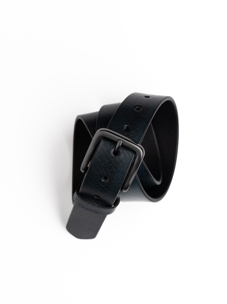 Cintura uomo blu in vera pelle con stampa effetto semilucido tono su tono, fibbia in nichel satinato e bordo a contrasto.