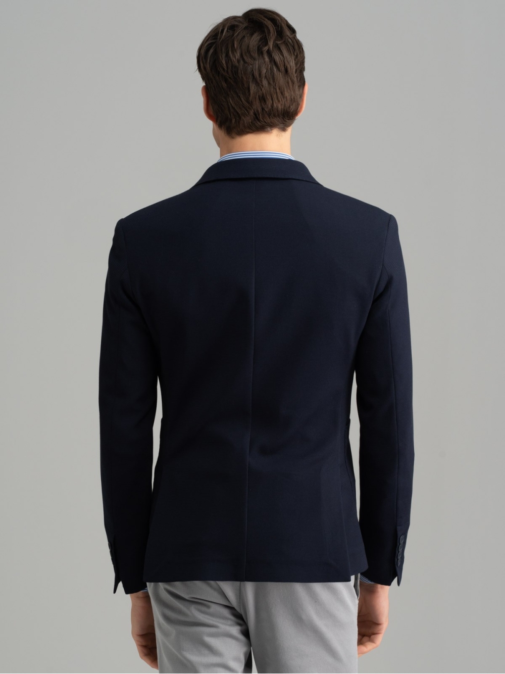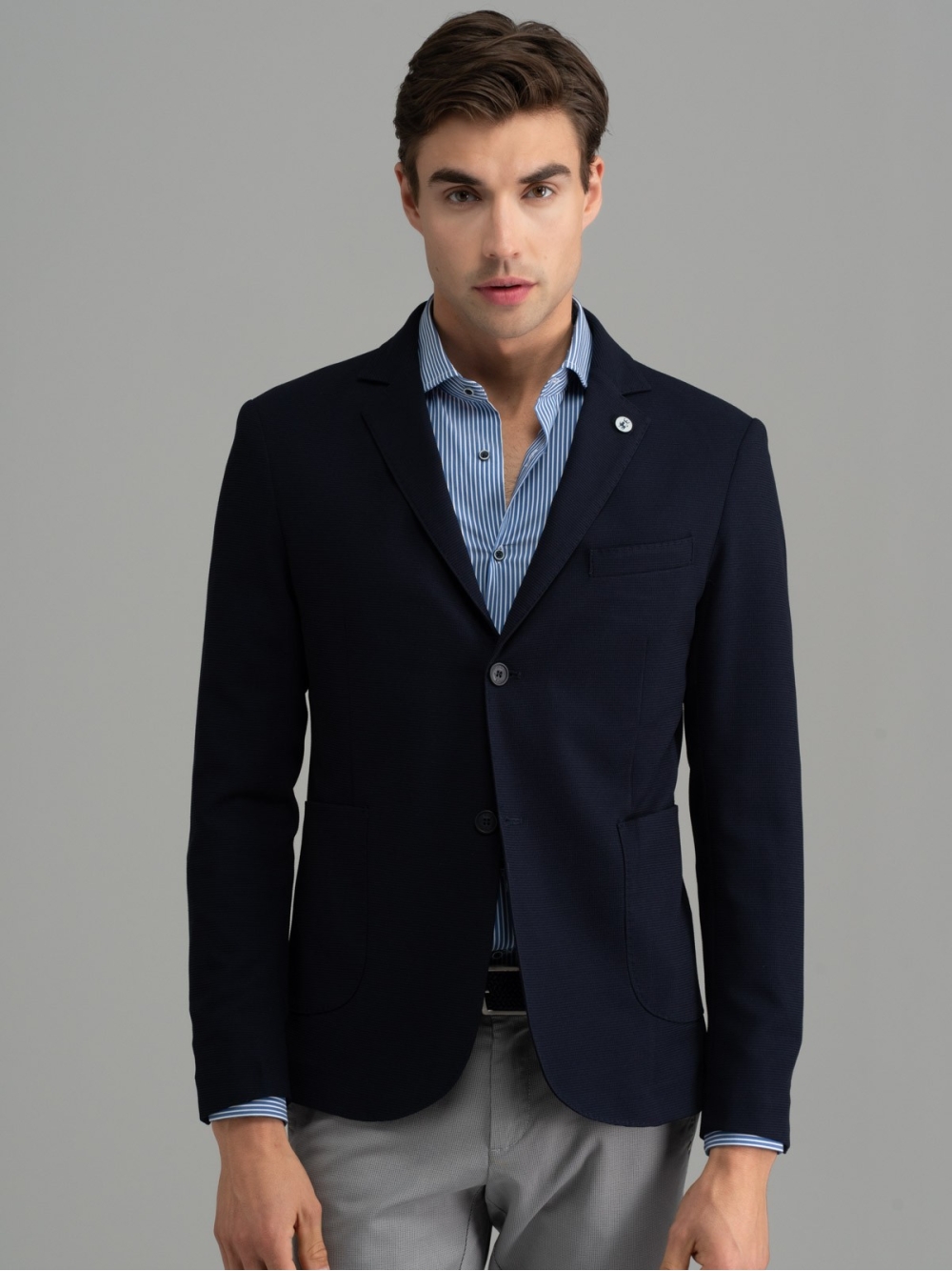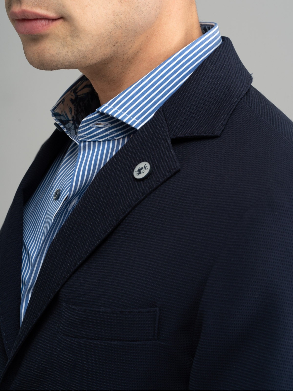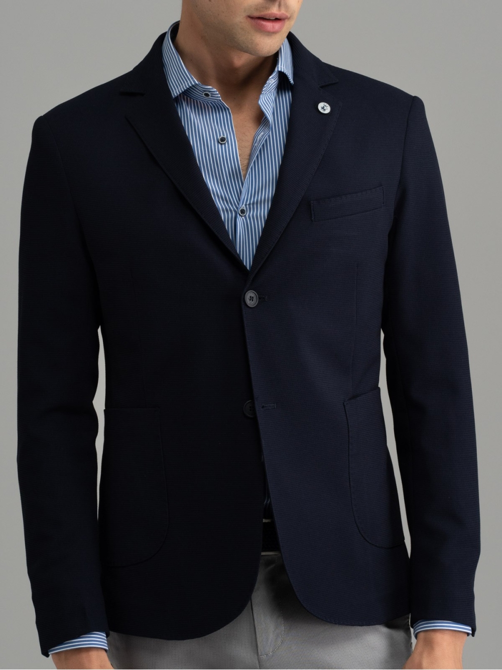 Giacca uomo sfoderata realizzata in tessuto elastico a micro nido d’ape. Finiture interne realizzate con bordature a contrasto e bottoni personalizzati.