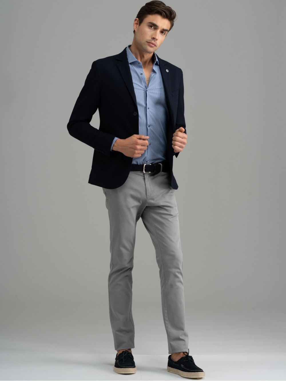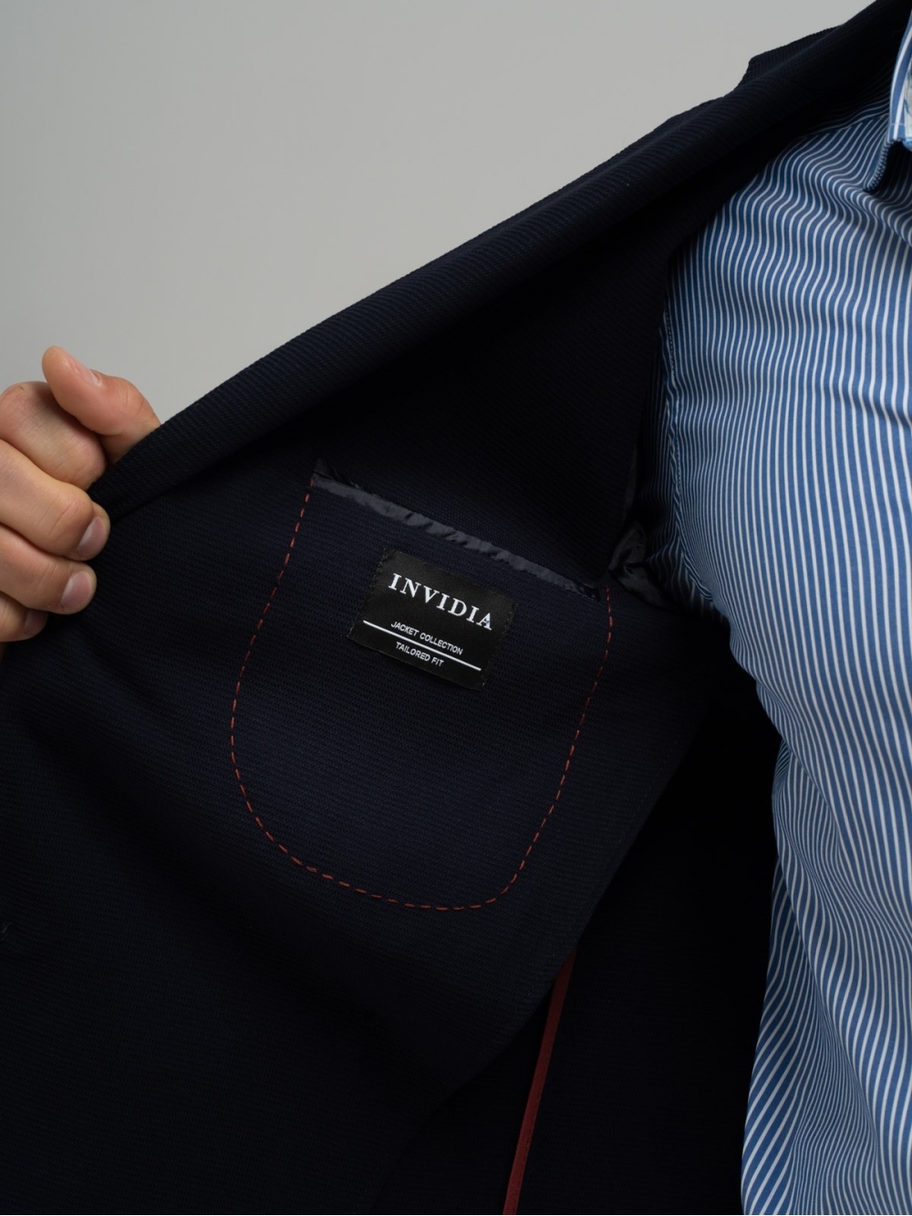 Giacca uomo sfoderata realizzata in tessuto elastico a micro nido d’ape, nei colori grigio e blu chiaro. L’accurata e ricca costruzione di questa giacca emerge dalle finiture interne, realizzate con bordature a contrasto, e dai bottoni personalizzati con incisione a laser. Per creare un look più ricercato è possibile abbinare il gilet uomo in tessuto armaturato negli stessi colori. Questo capo – come tutte le giacche uomo del brand – presenta una piccola spilletta con il logo INVIDIA 1973.