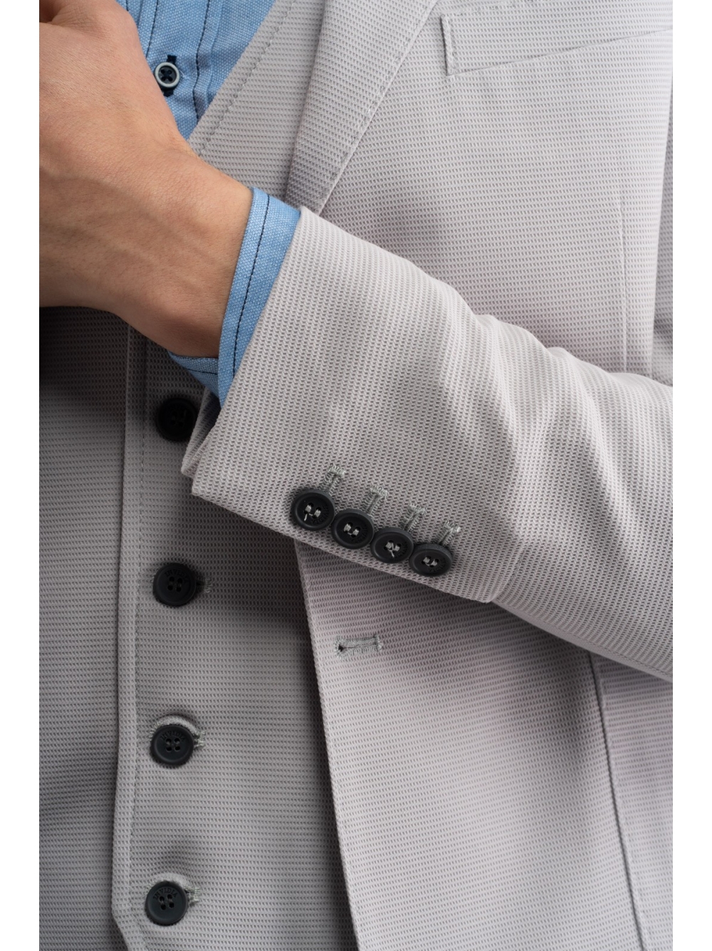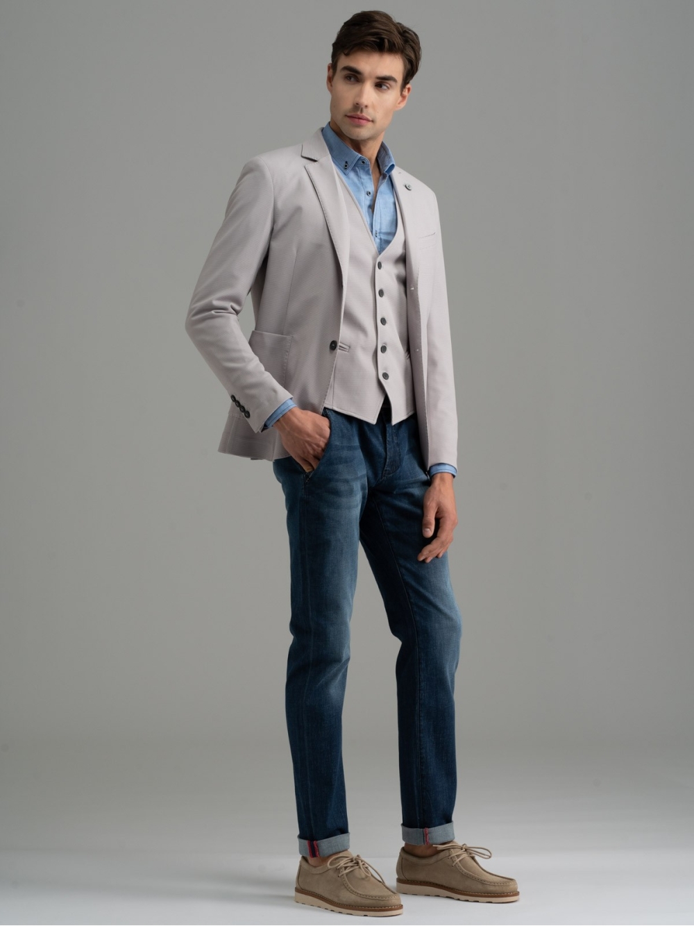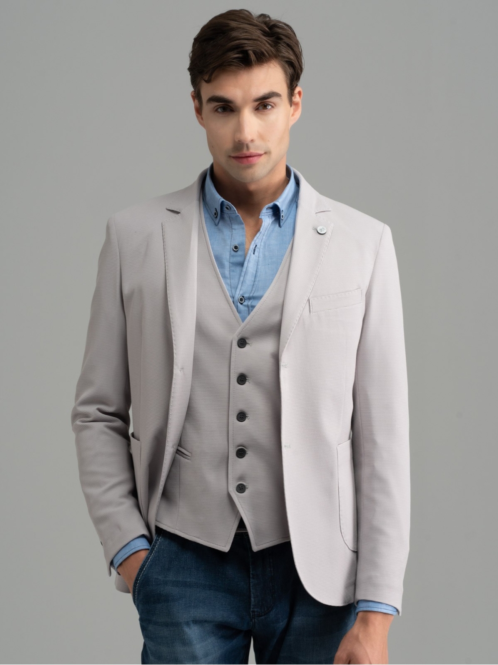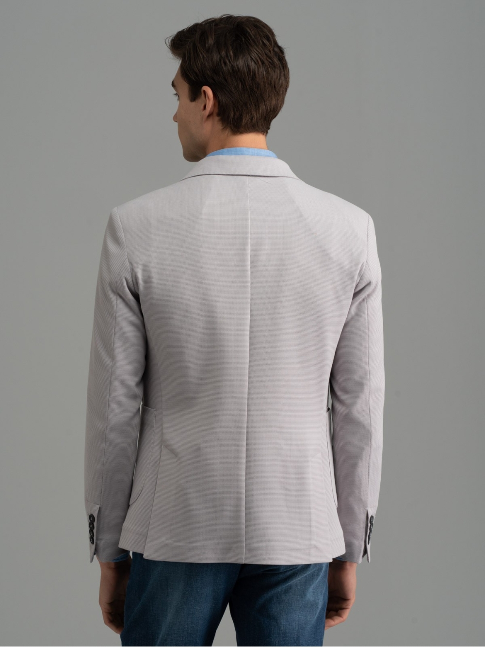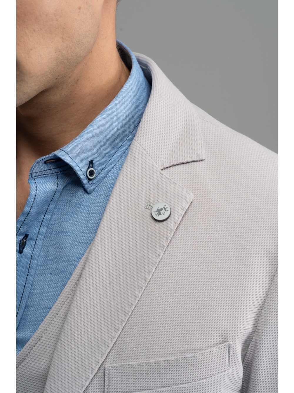 Giacca uomo sfoderata realizzata in tessuto elastico a micro nido d’ape, nei colori grigio e blu chiaro. L’accurata e ricca costruzione di questa giacca emerge dalle finiture interne, realizzate con bordature a contrasto, e dai bottoni personalizzati con incisione a laser. Per creare un look più ricercato è possibile abbinare il gilet uomo in tessuto armaturato negli stessi colori. Questo capo – come tutte le giacche uomo del brand – presenta una piccola spilletta con il logo INVIDIA 1973.