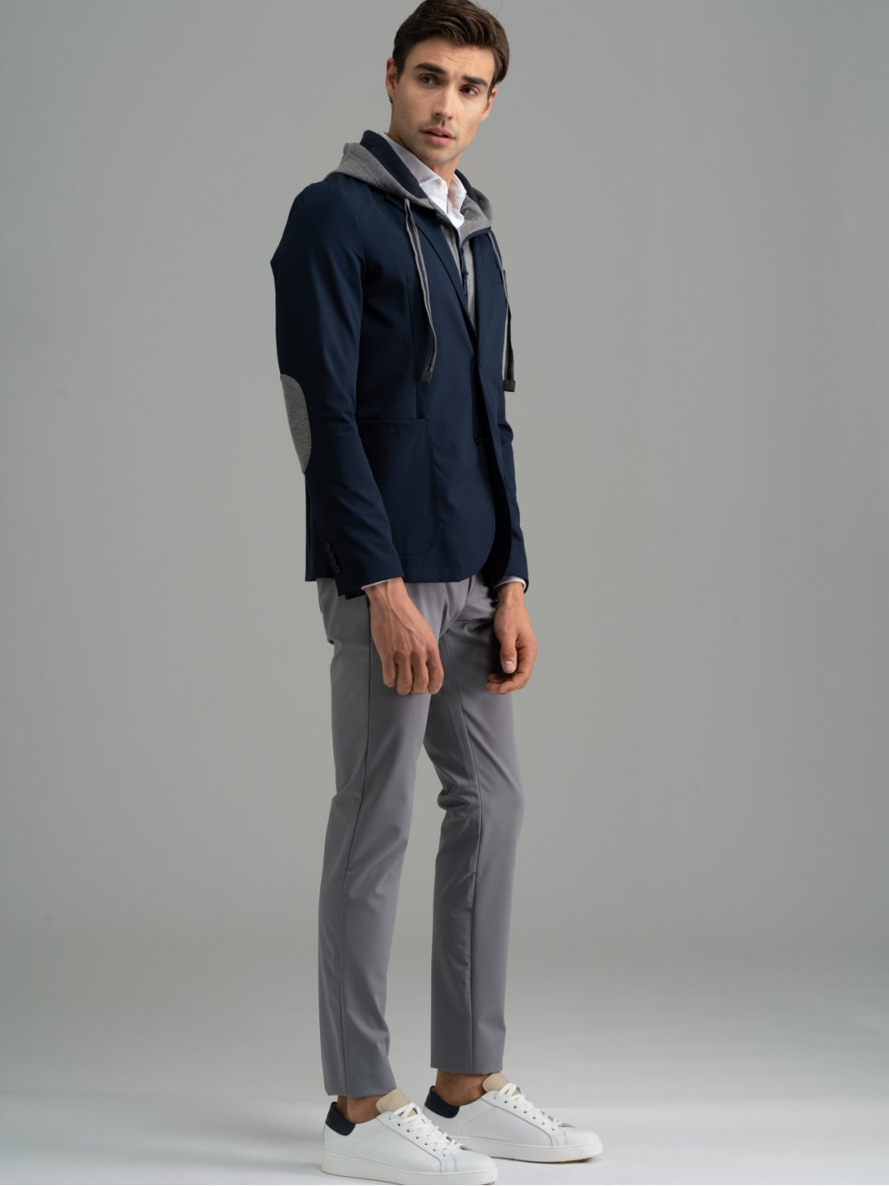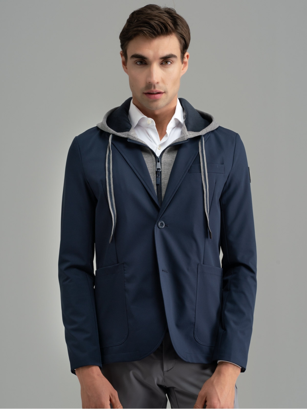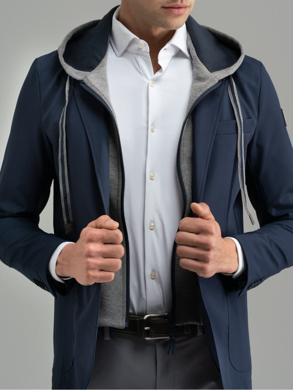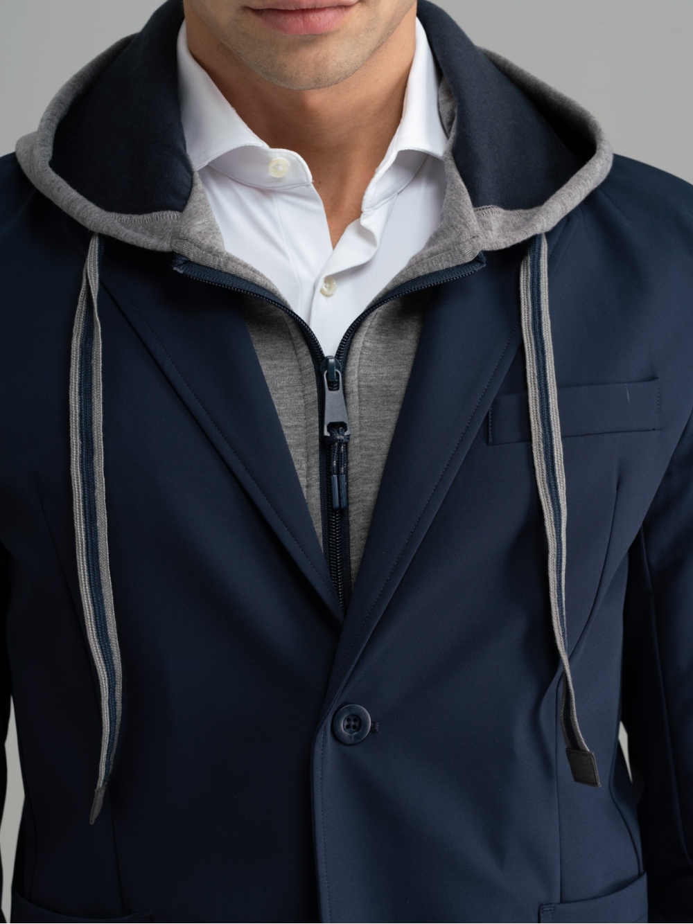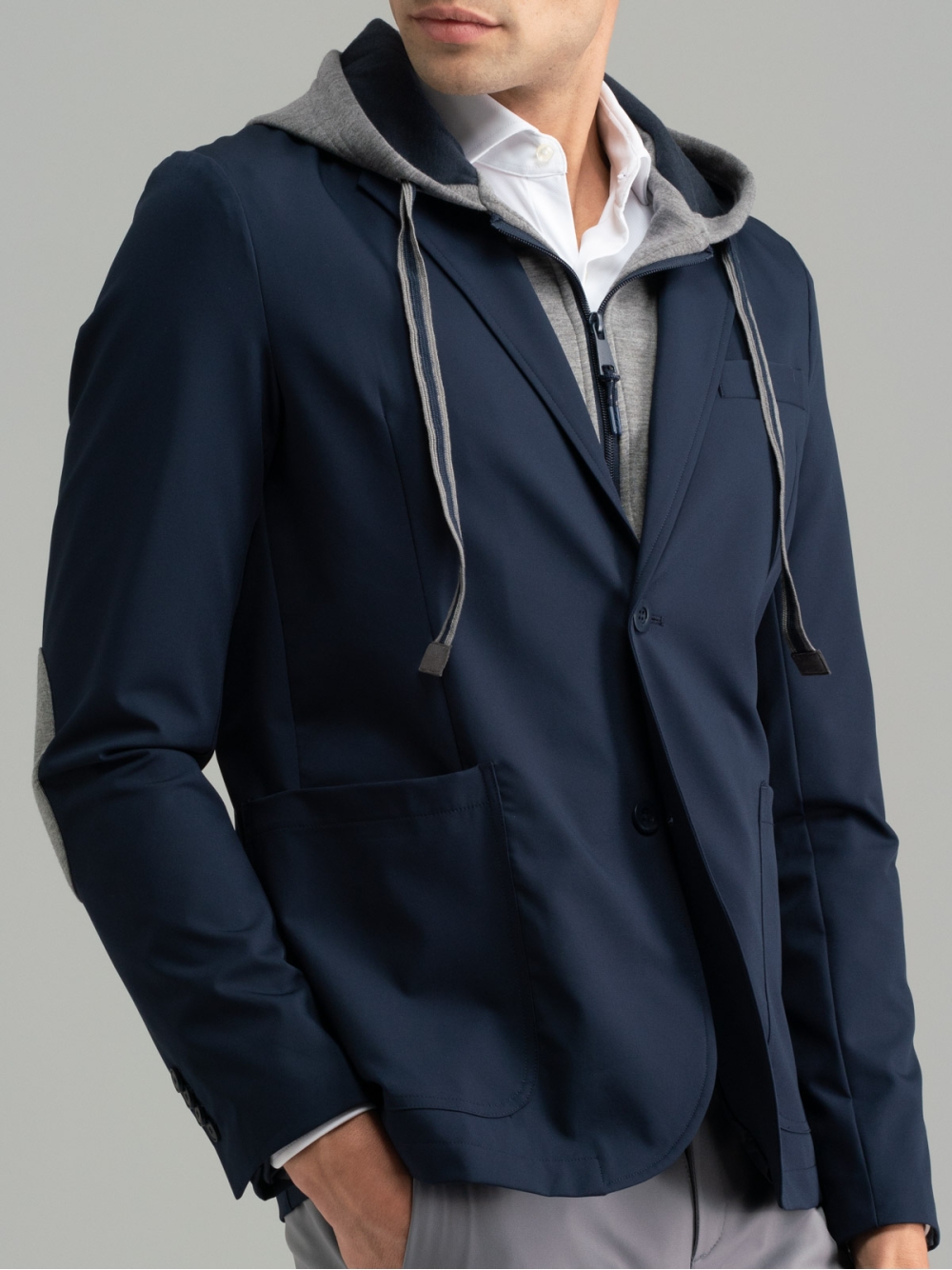 Blazer uomo realizzato in tessuto tecnico caratterizzato da una pettorina interna staccabile in felpa Scuba e cappuccio dello stesso materiale. Questa giacca è costruita a regola d’arte in quanto internamente presenta bordature, la mezza fodera, taschine per riporre chiavi, cuffiette o cellulare rifinite con lo stesso nastro del cappuccio. Il perfetto mix tra giacca elegante e felpa, crea un capo unico ideale per chi è alla ricerca di un look giovanile e urban. Inoltre, i materiali tecnici come il tessuto TECNO e quello Scuba, aggiungono grande contemporaneità al capo, che potrà essere abbinato sia a pantaloni uomo joggers che ai classici chinos.