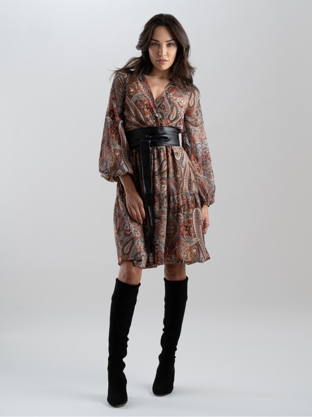 Abito donna con stampa cashmere ire colorata, scollo a V, maniche lunghe dal volume morbido ed elastico in vita che raccoglie il volume. Con questo capo aggiungete un tocco bohémien al vostro look autunnale.(La cintura non è inclusa)