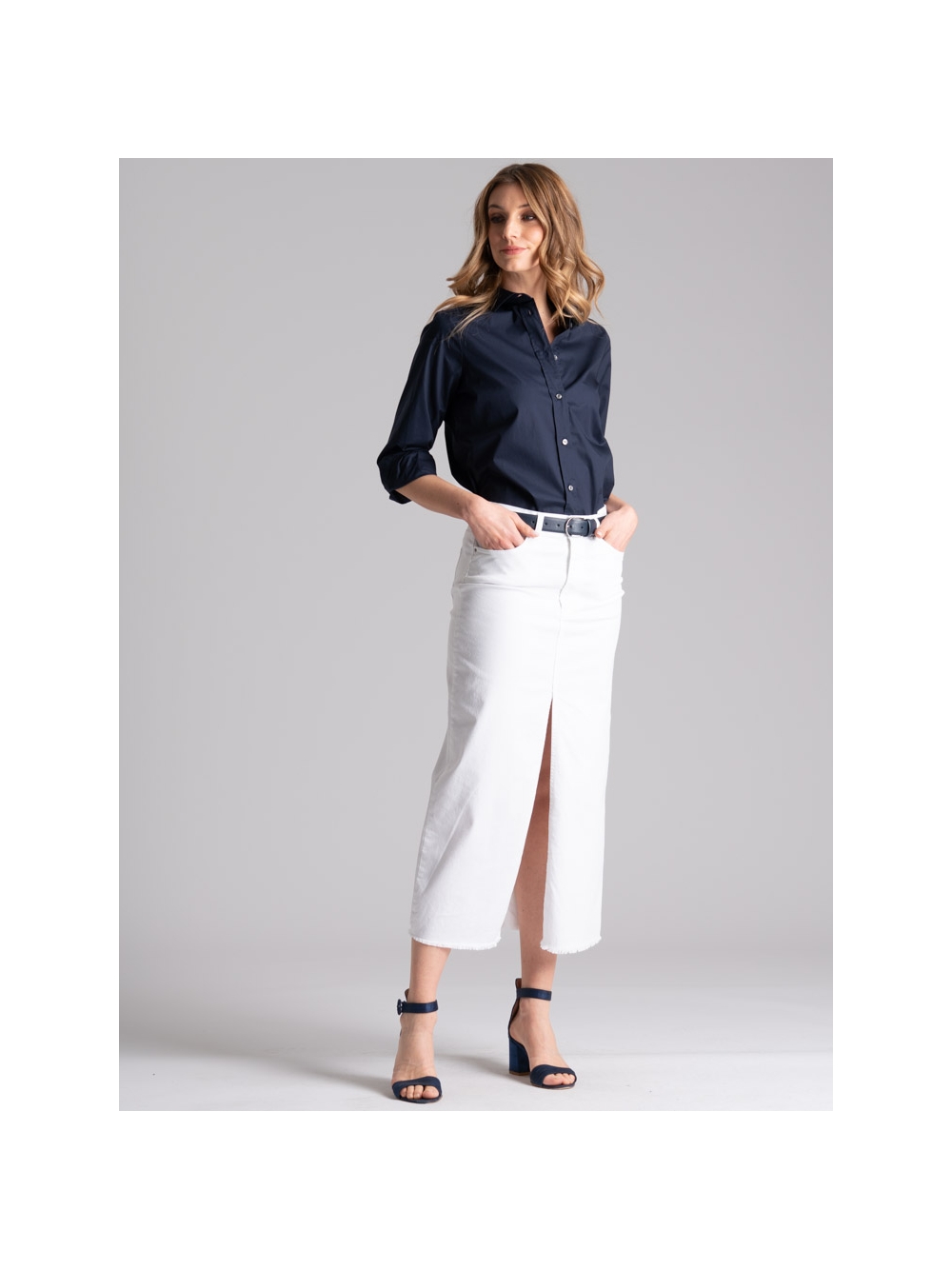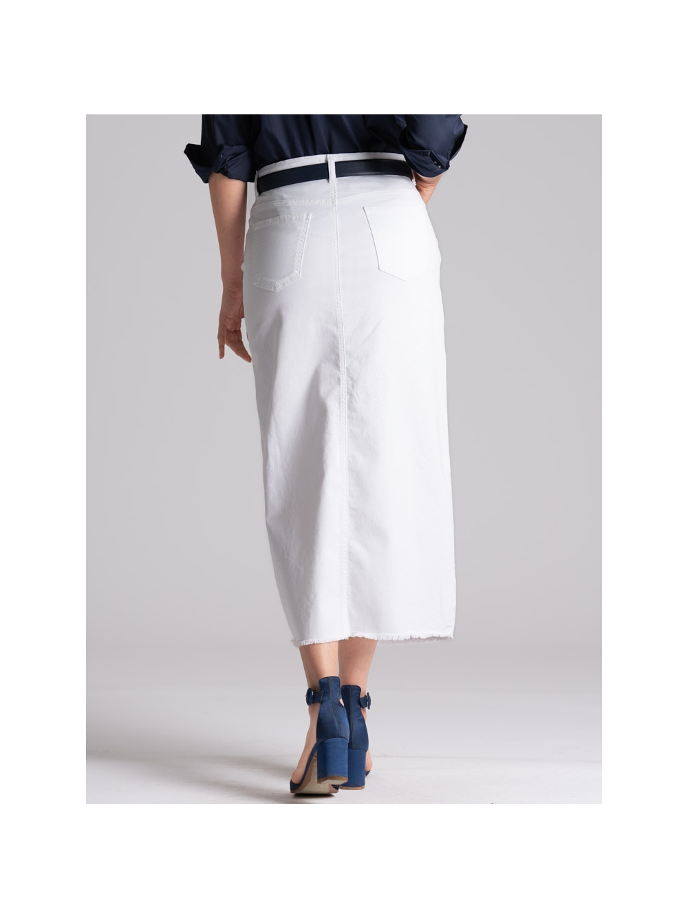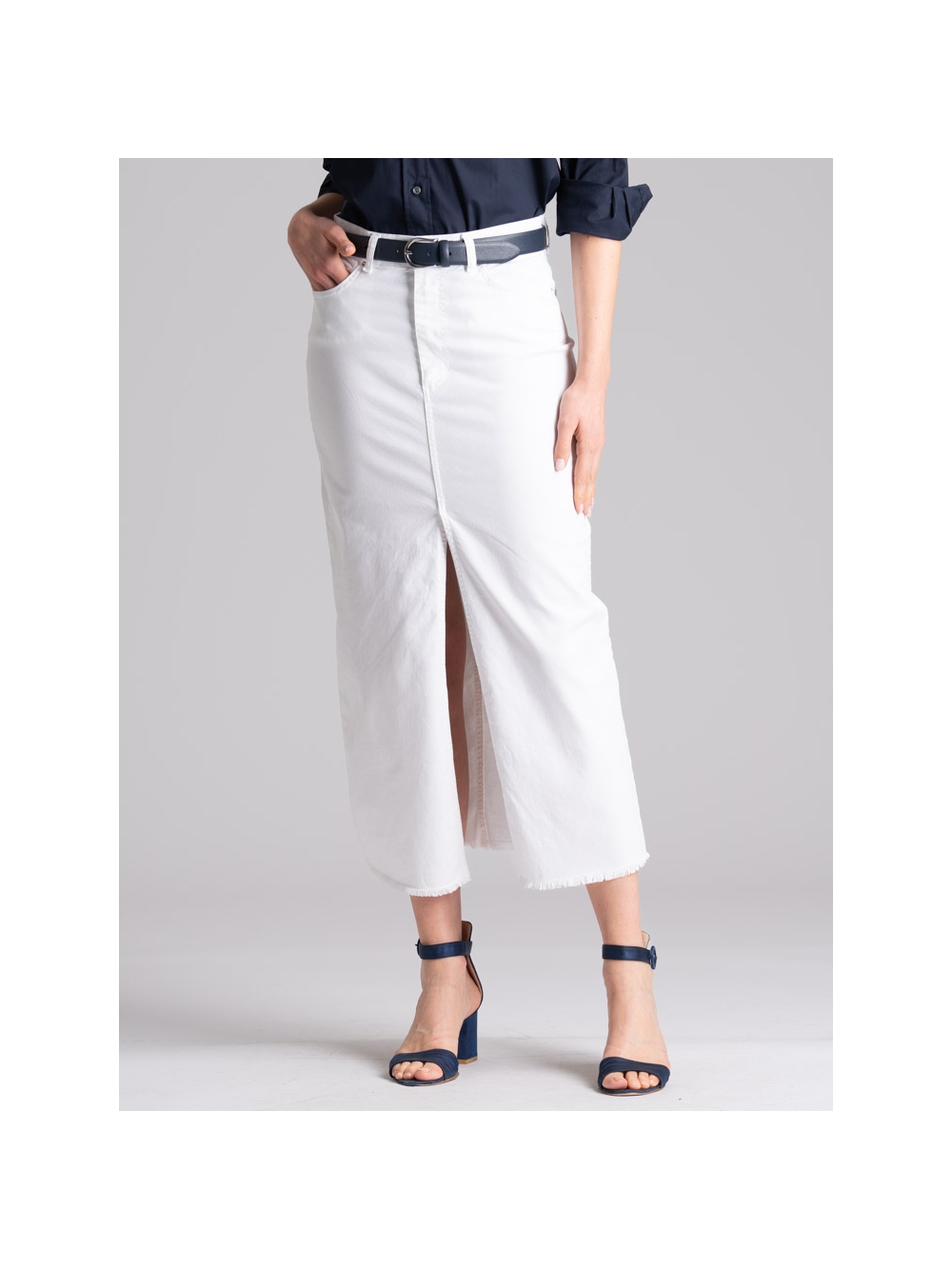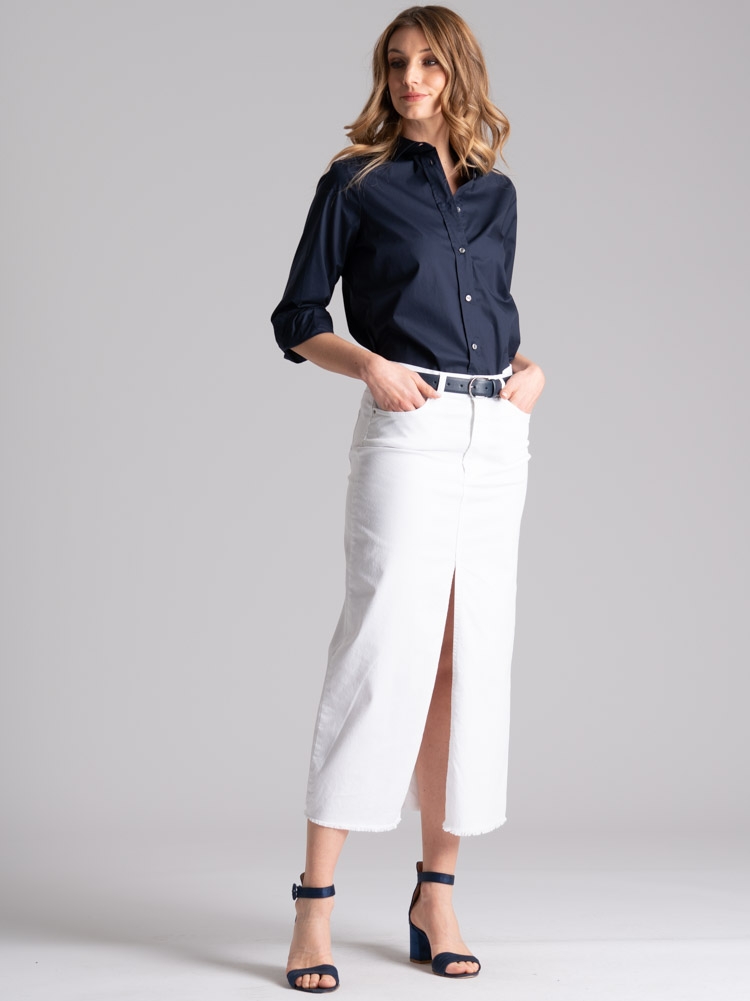Gonna donna taglio jeans, realizzata in fresca gabardina stretch di cotone color bianco tinta unita, caratterizzata da una lunghezza midi, spacco sul davanti e sfrangiatura sul fondo.