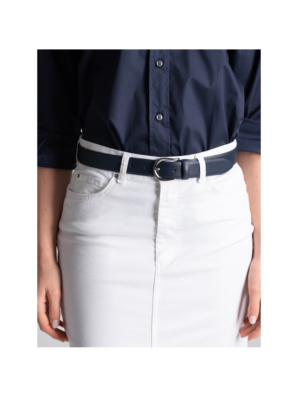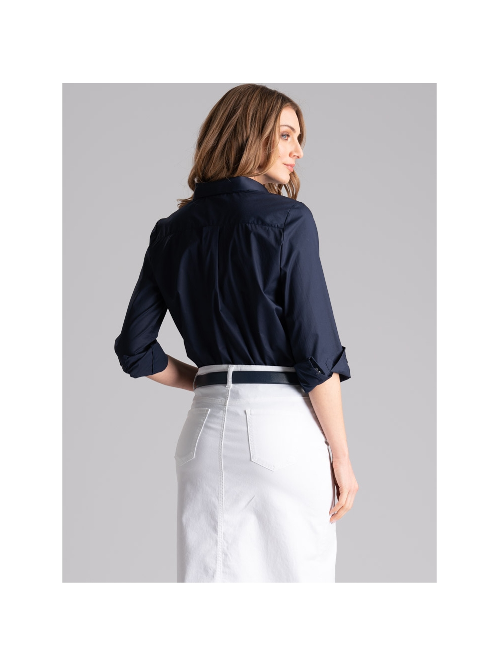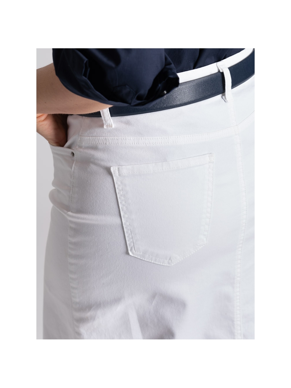Gonna donna taglio jeans, realizzata in fresca gabardina stretch di cotone color bianco tinta unita, caratterizzata da una lunghezza midi, spacco sul davanti e sfrangiatura sul fondo.