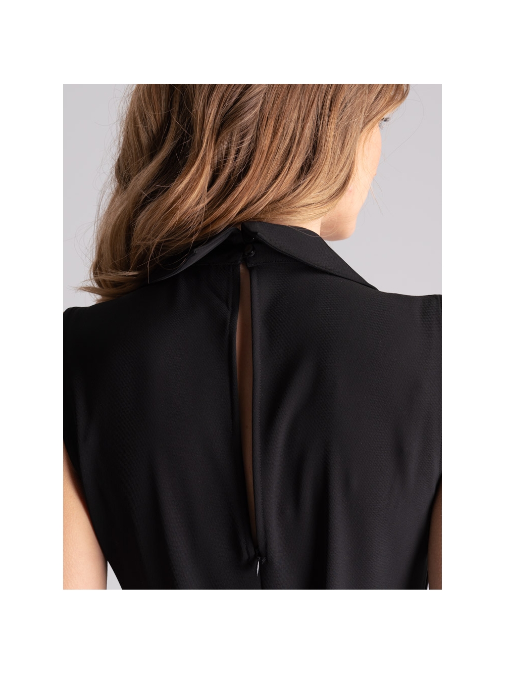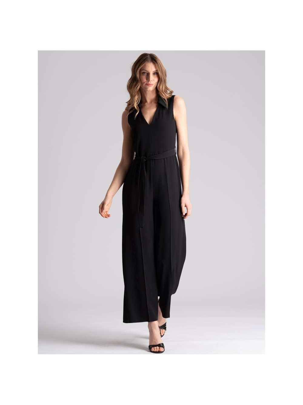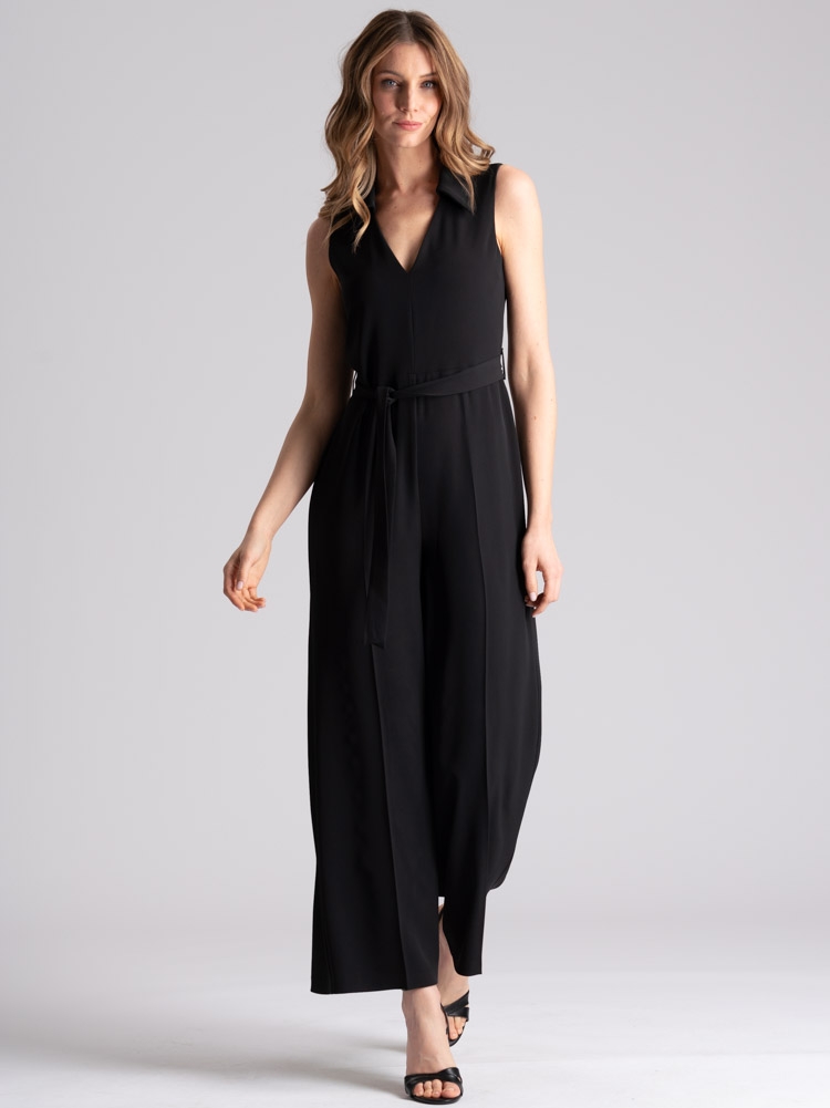 Tuta donna smanicata tinta unita nero, realizzata in tessuto cadì molto fluido per una vestibilità confortevole. Questa tuta donna è caratterizzata dal sopra con scollo a V e collo a camicia, chiusura posteriore con bottoni e taglio a goccia, cintura di tessuto in vita e pantalone fluido con gamba dritta.