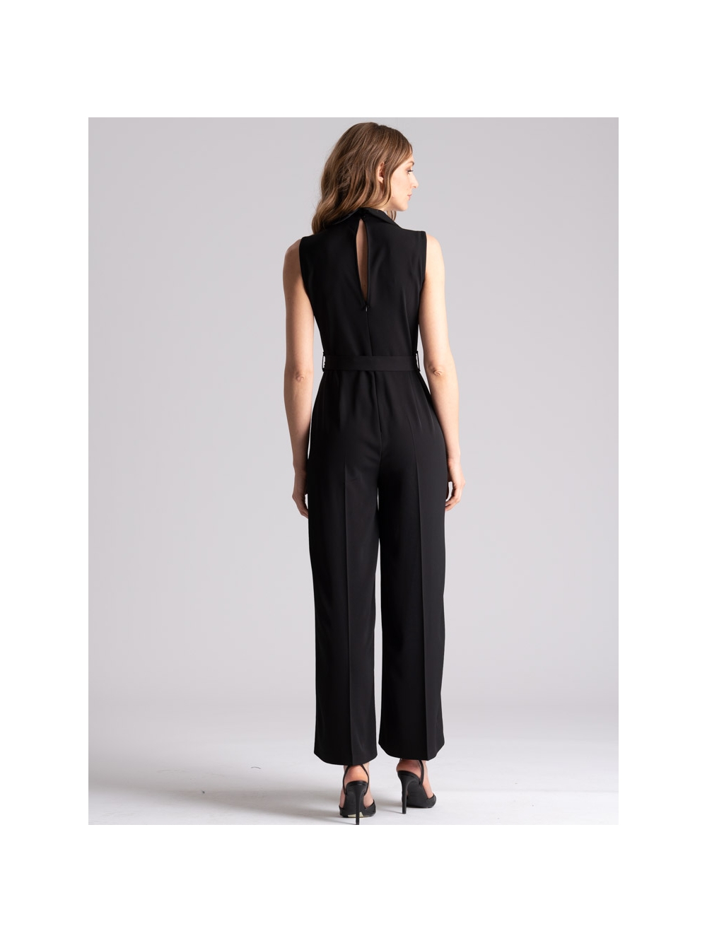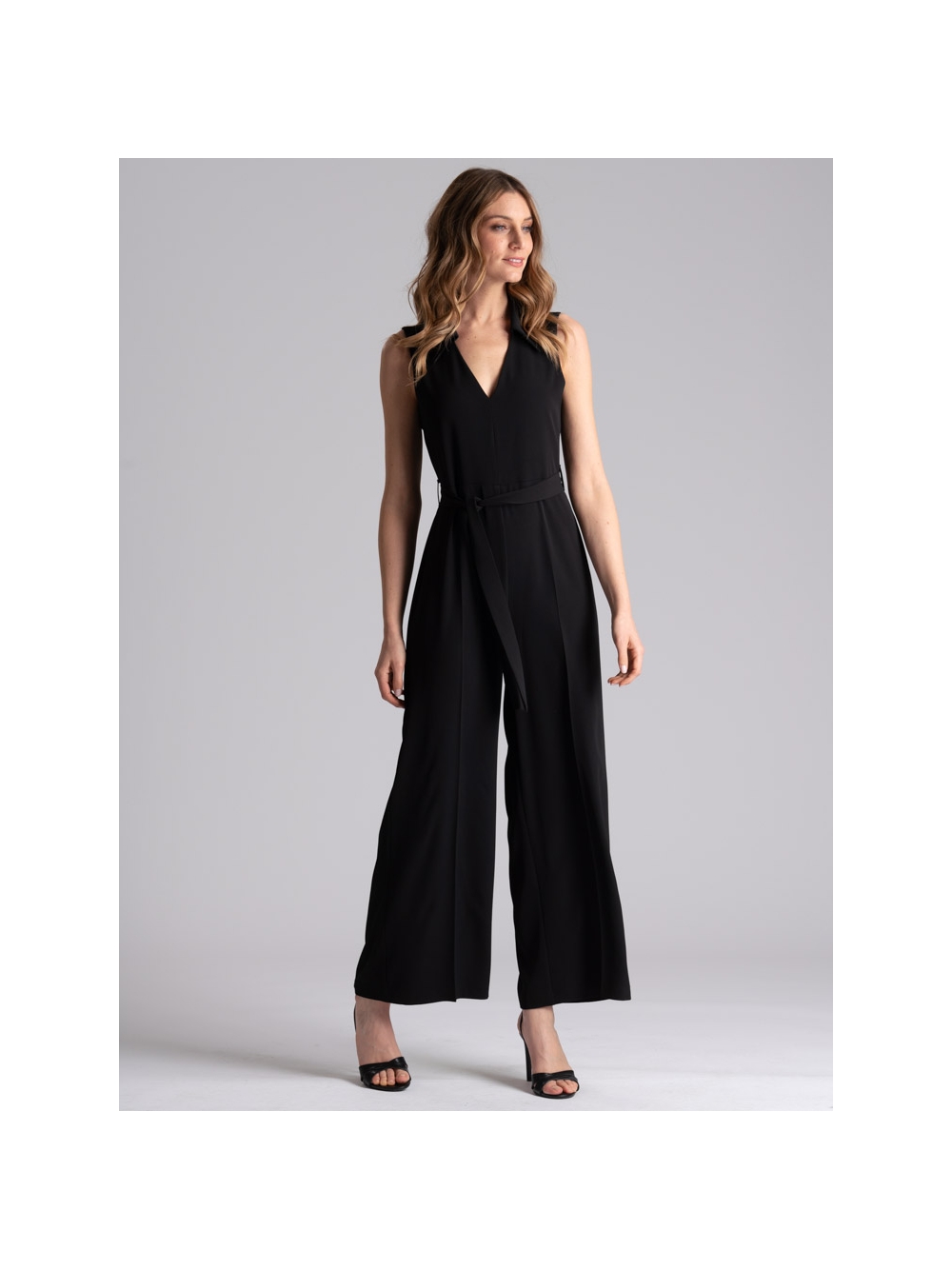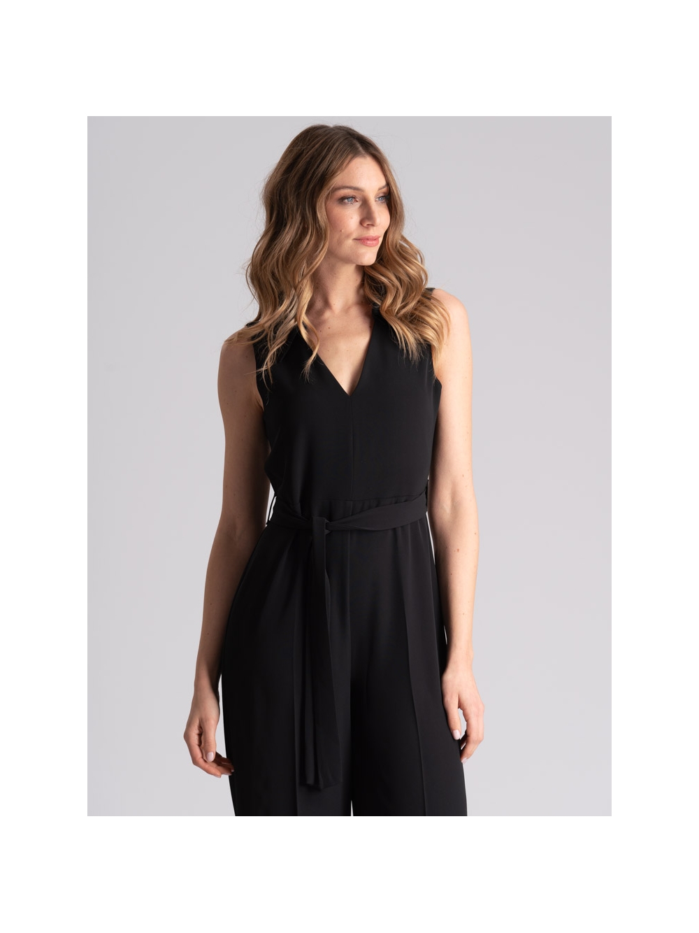 Tuta donna smanicata tinta unita nero, realizzata in tessuto cadì molto fluido per una vestibilità confortevole. Questa tuta donna è caratterizzata dal sopra con scollo a V e collo a camicia, chiusura posteriore con bottoni e taglio a goccia, cintura di tessuto in vita e pantalone fluido con gamba dritta.