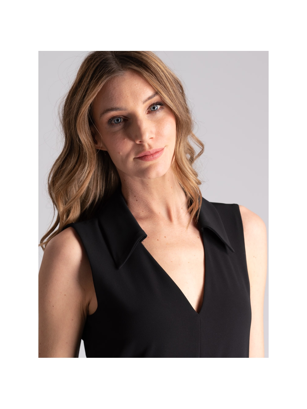 Tuta donna fluida smanicata con pantalone a gamba dritta, scollo a V con collo a camicia e chiusura a goccia con bottoni.