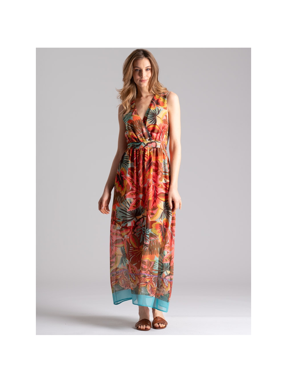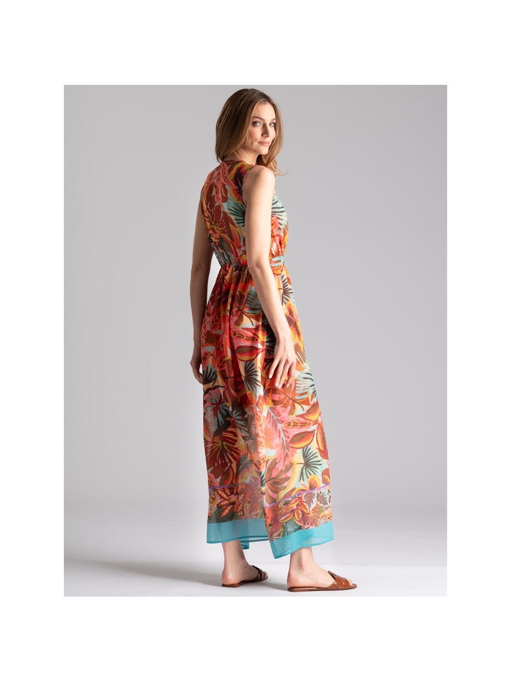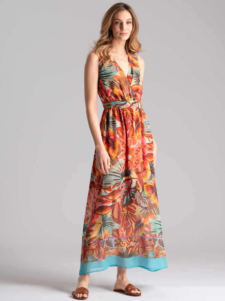 Abito donna con stampa floreale multicolore, modello smanicato con lunghezza alla caviglia e scollo incrociato sul davanti.