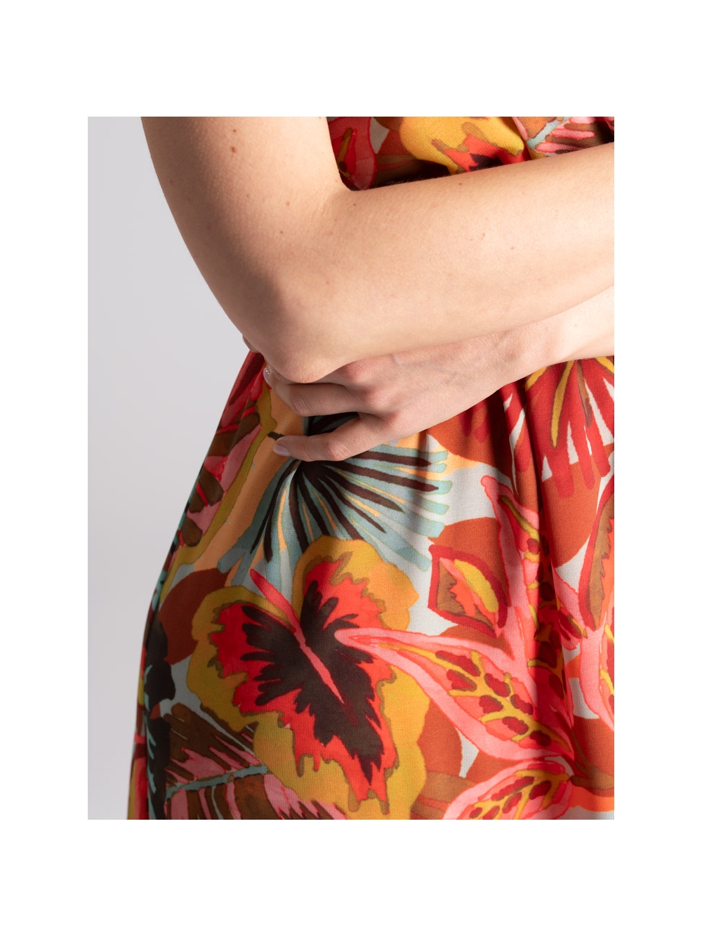 Abito donna smanicato con lunghezza alla caviglia e scollo incrociato sul davanti, realizzato in tessuto con stampa floreale multicolore e balza tinta unita sul fondo