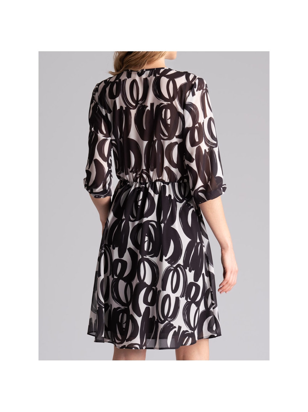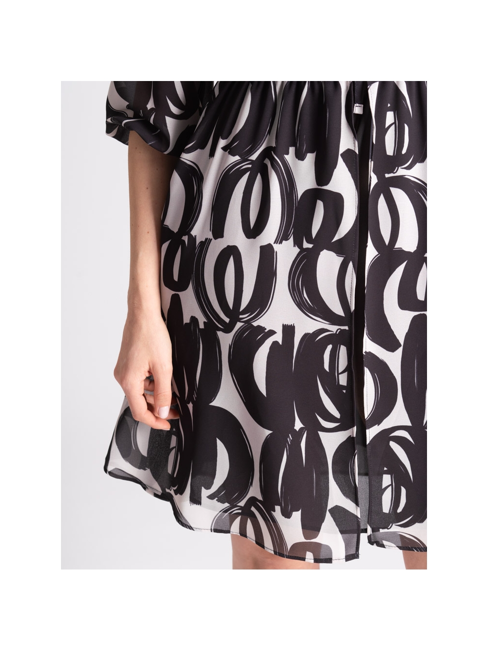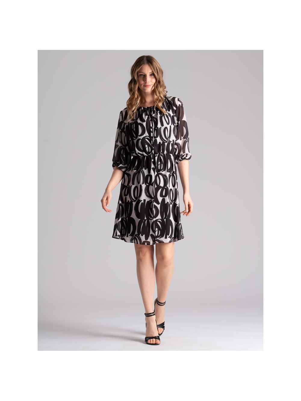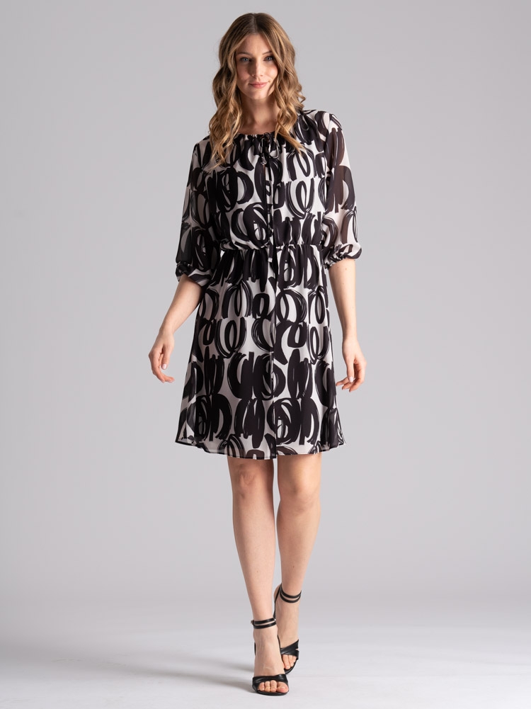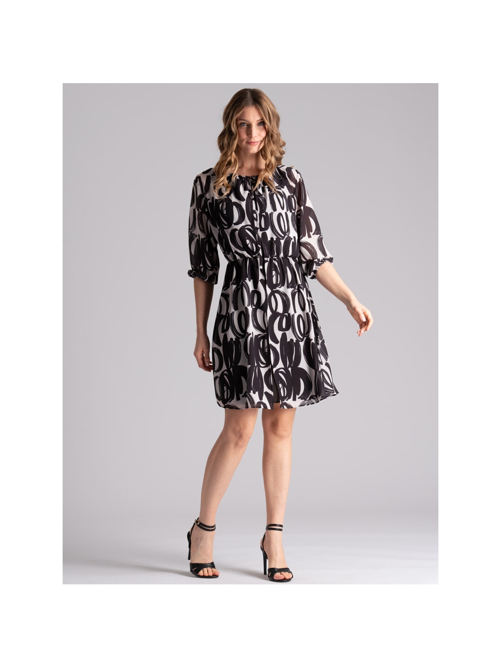 Abito donna con manica tre quarti e lunghezza sotto al ginocchio realizzato in georgette con stampa fantasia monocromatica color ghiaccio e nero. Questo abito presenta una scollatura a goccia con laccetti, è arricciato in vita e ha un effetto doppio sulla gonna che crea movimento e femminilità.