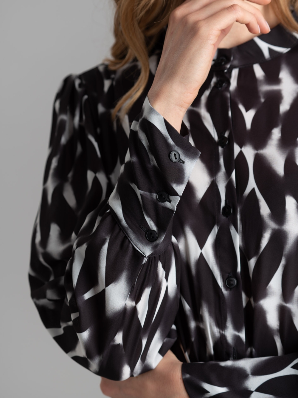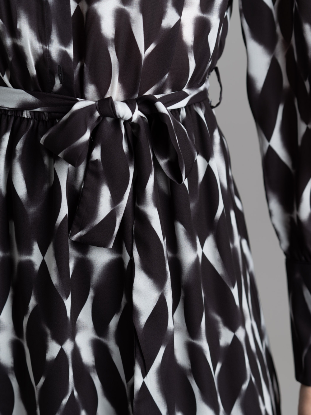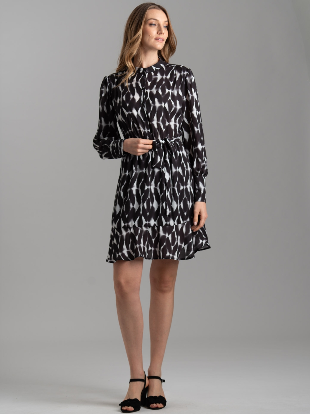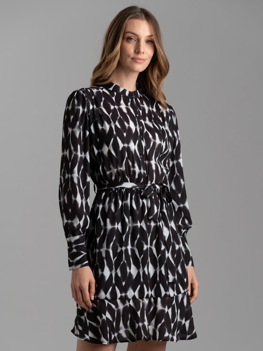 Abito donna realizzato in tessuto con stampa allover geometrica sfumata nero-bianco esclusiva Invidia 1973, caratterizzato dalla manica lunga con polso a tre bottoni, elastico in vita per una migliore vestibilità, cintura nello stesso tessuto e chiusura con bottoni davanti con collo alla coreana.