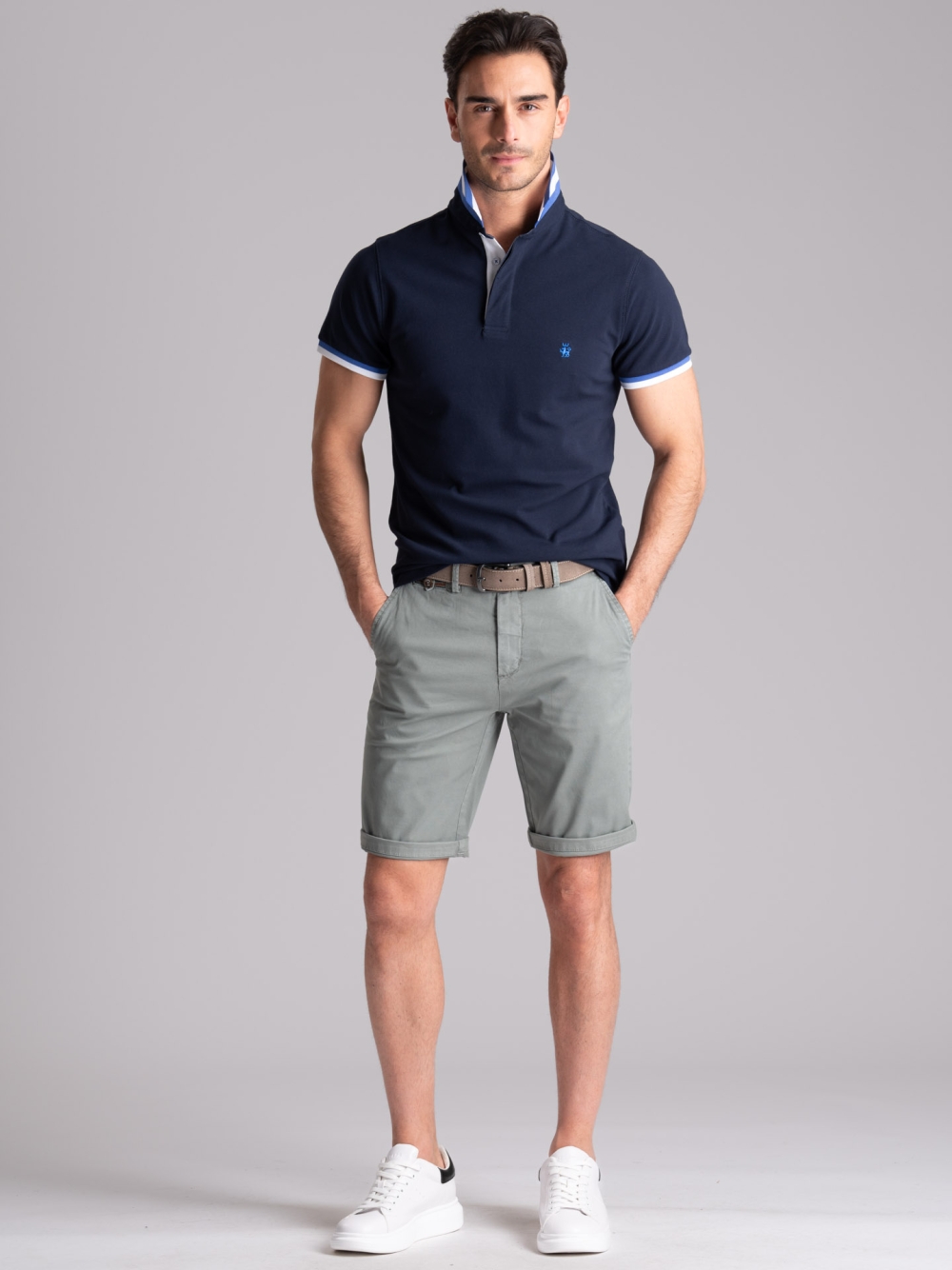 Bermuda uomo in cotone armaturato a nido d’ape, modello chino con taglio semi sartoriale, rifinito con nastri applicati sulle tasche e piping lungo la cintura.