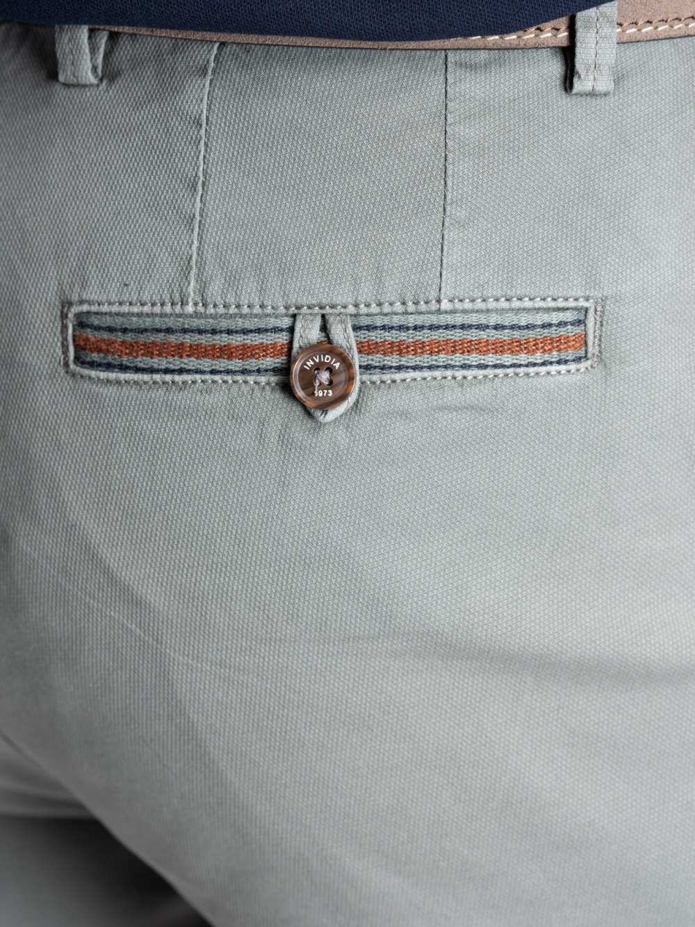 Bermuda uomo modello chino realizzato in tessuto di cotone armaturato a nido d’ape stretch per una vestibilità confortevole. Questo bermuda è caratterizzato da un nastro applicato sul taschino davanti, ripreso anche sulle tasche posteriori a filetto con picanello e finale con micro risvolto. Inoltre, tutta la cintura interna è realizzata con tessuto a stampa floreale. Questo bermuda uomo è un modello perfettamente rifinito in ogni dettaglio con cura semi sartoriale, adatto da indossare anche in città. Disponibile nelle varianti colore blu chiaro, grigio chiaro, biscotto e bianco.