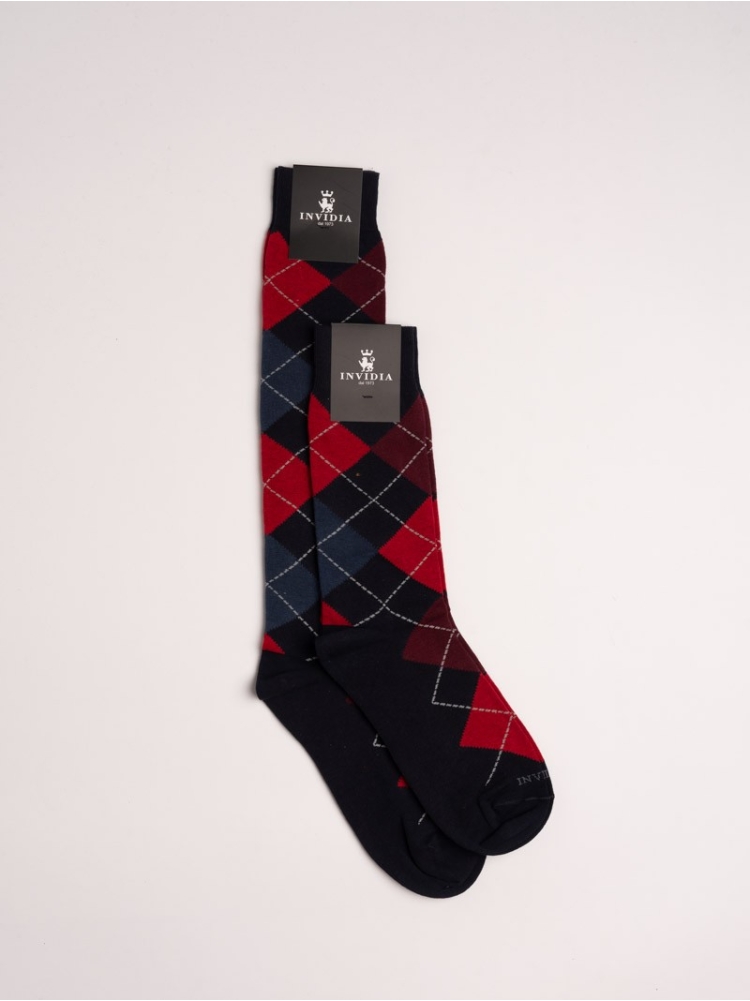 Calze uomo disegno rombo multicolor nei toni dei blu e rossi. Calza misura lunga al ginocchio.