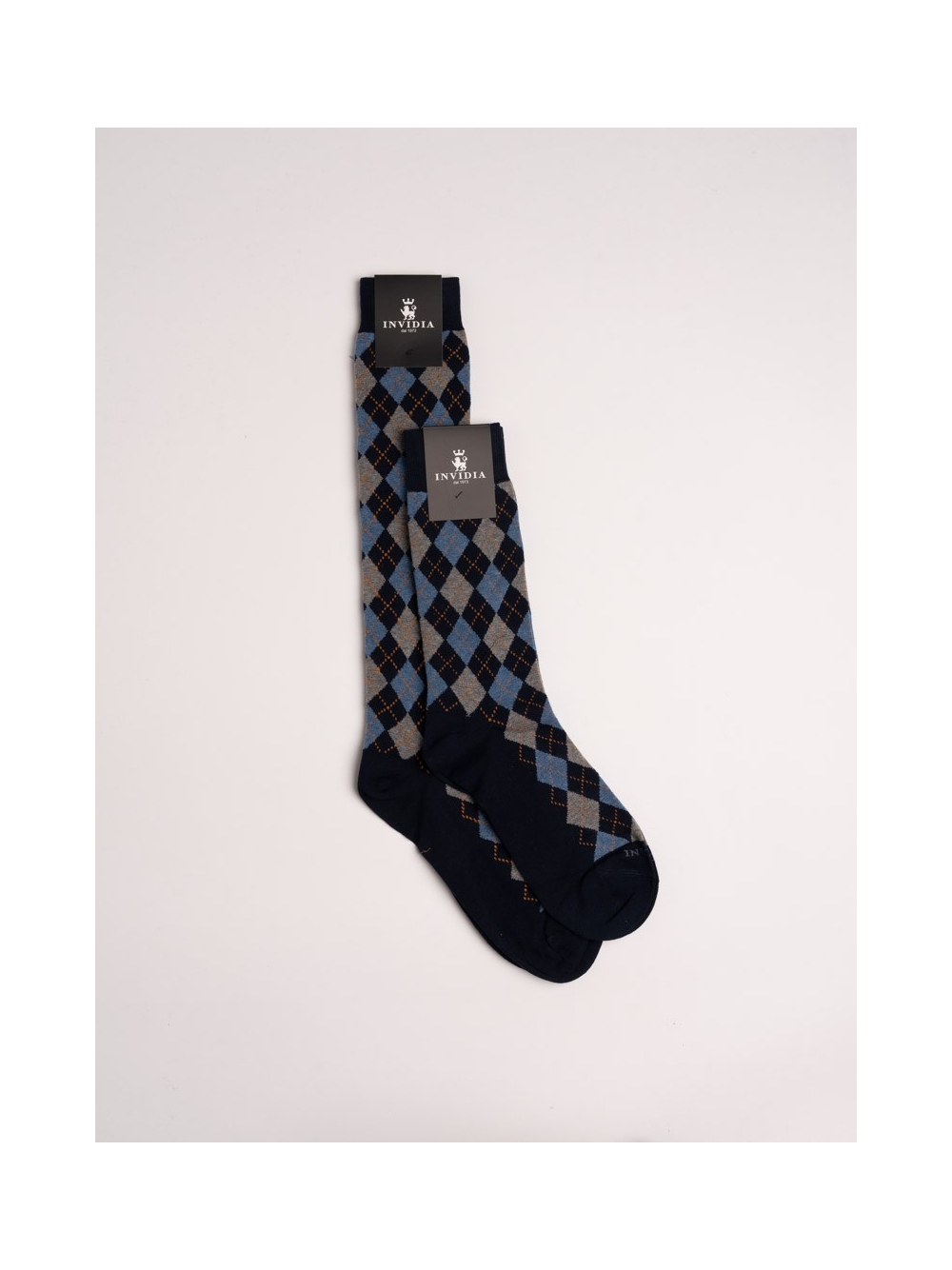 Calze uomo disegno rombo piccolo multicolor nei toni dei blu/avio/grio . Calza misura lunga al ginocchio.