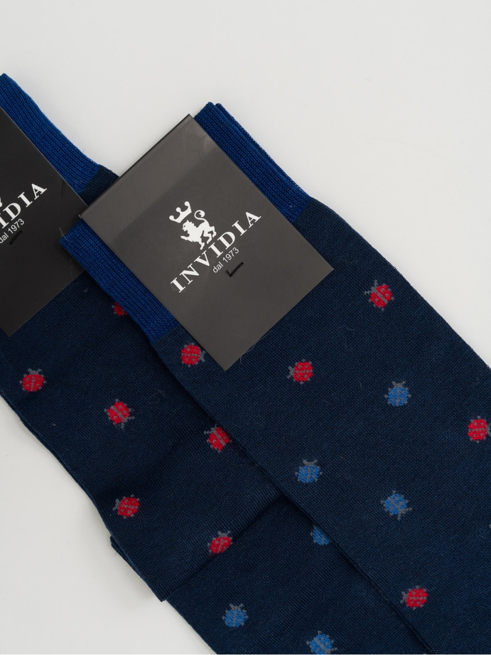 Calza uomo in fresco cotone estivo con fantasia a coccinelle nei toni del blu, da indossare come porta fortuna. Le calze sono disponibili in due lunghezze, corta e lunga