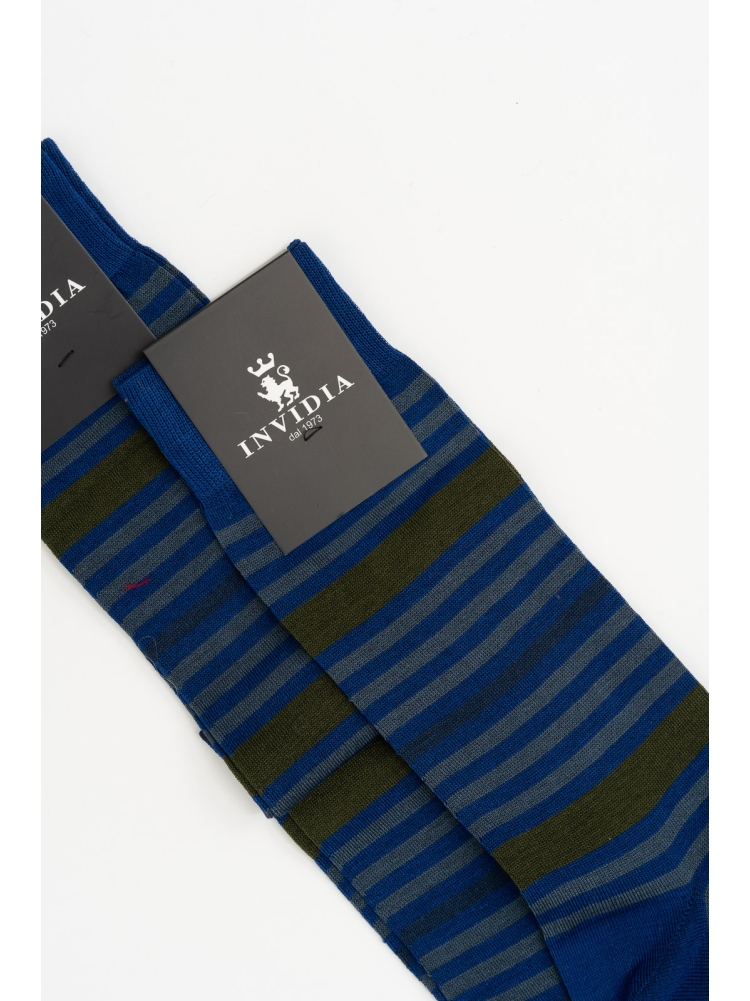Calza uomo in fresco cotone estivo con fantasia multiriga nei toni del bluette e del verde, disponibili in due lunghezze, corta e lunga.