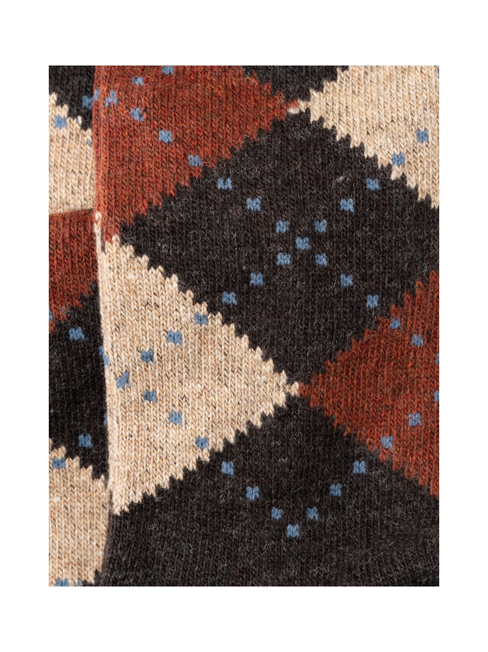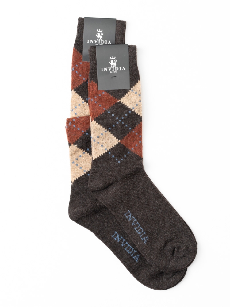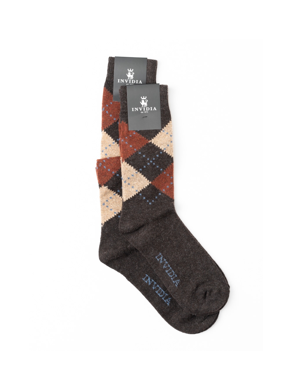 Calza uomo in lana misto cashmere, con fantasia a rombi in due varianti, disponibile nella versione corta e lunga.