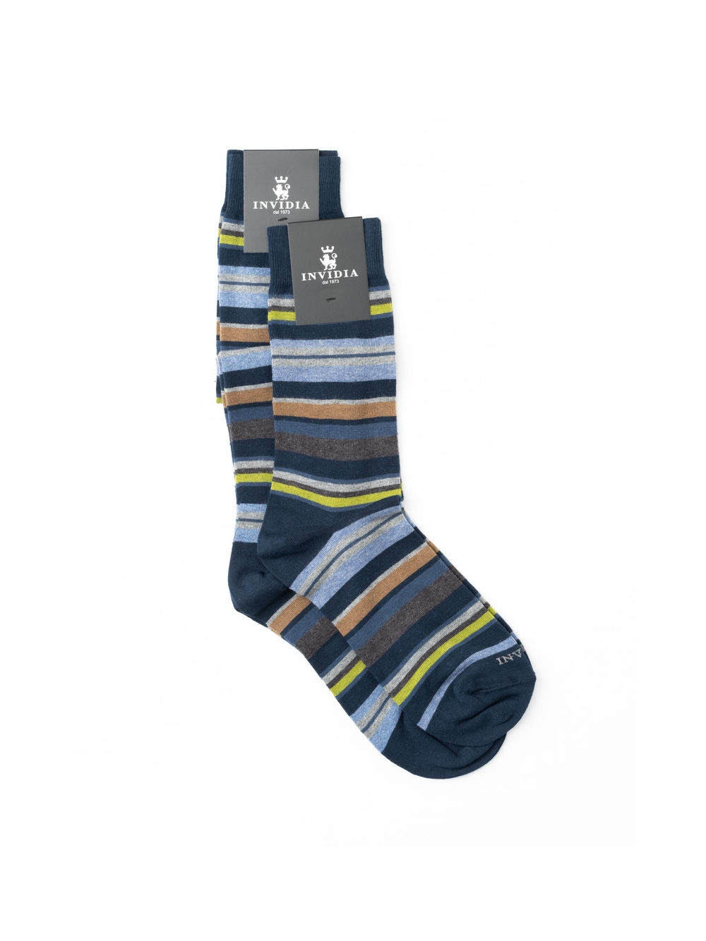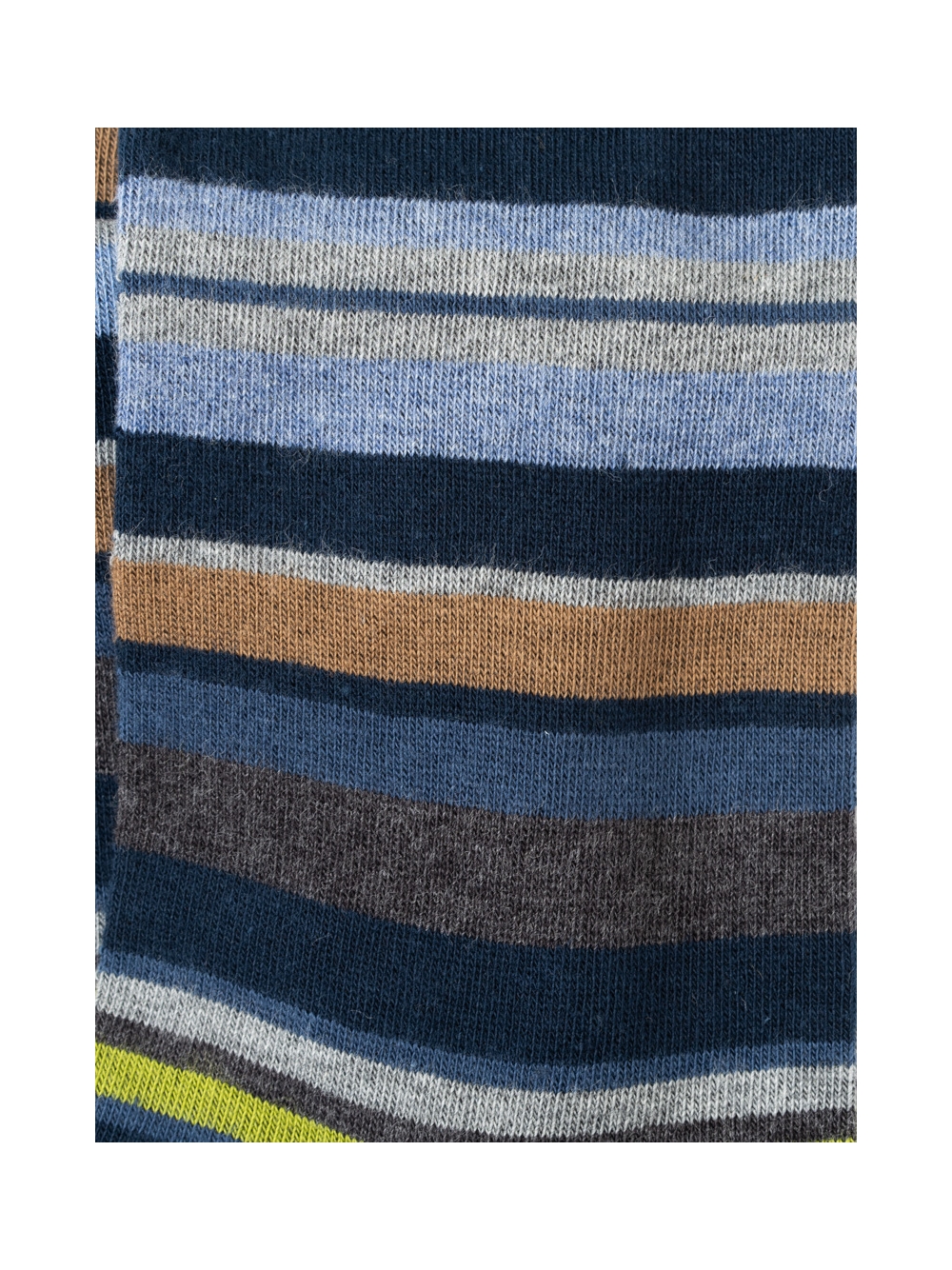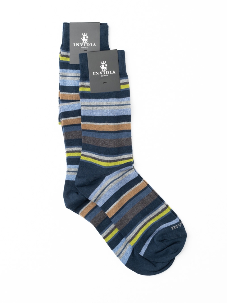Calza uomo con fantasia multirighe nella variante color blu-avio-tortora-lime-grigio e avio-blu-grigio-bordeaux-militare, disponibile in due lunghezze, corta e lunga.
