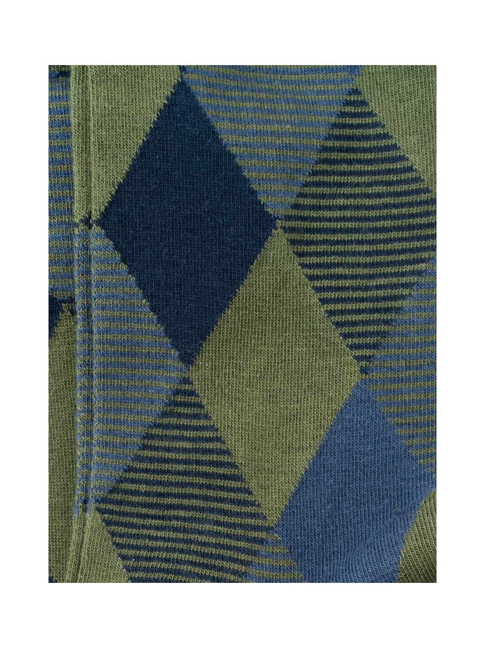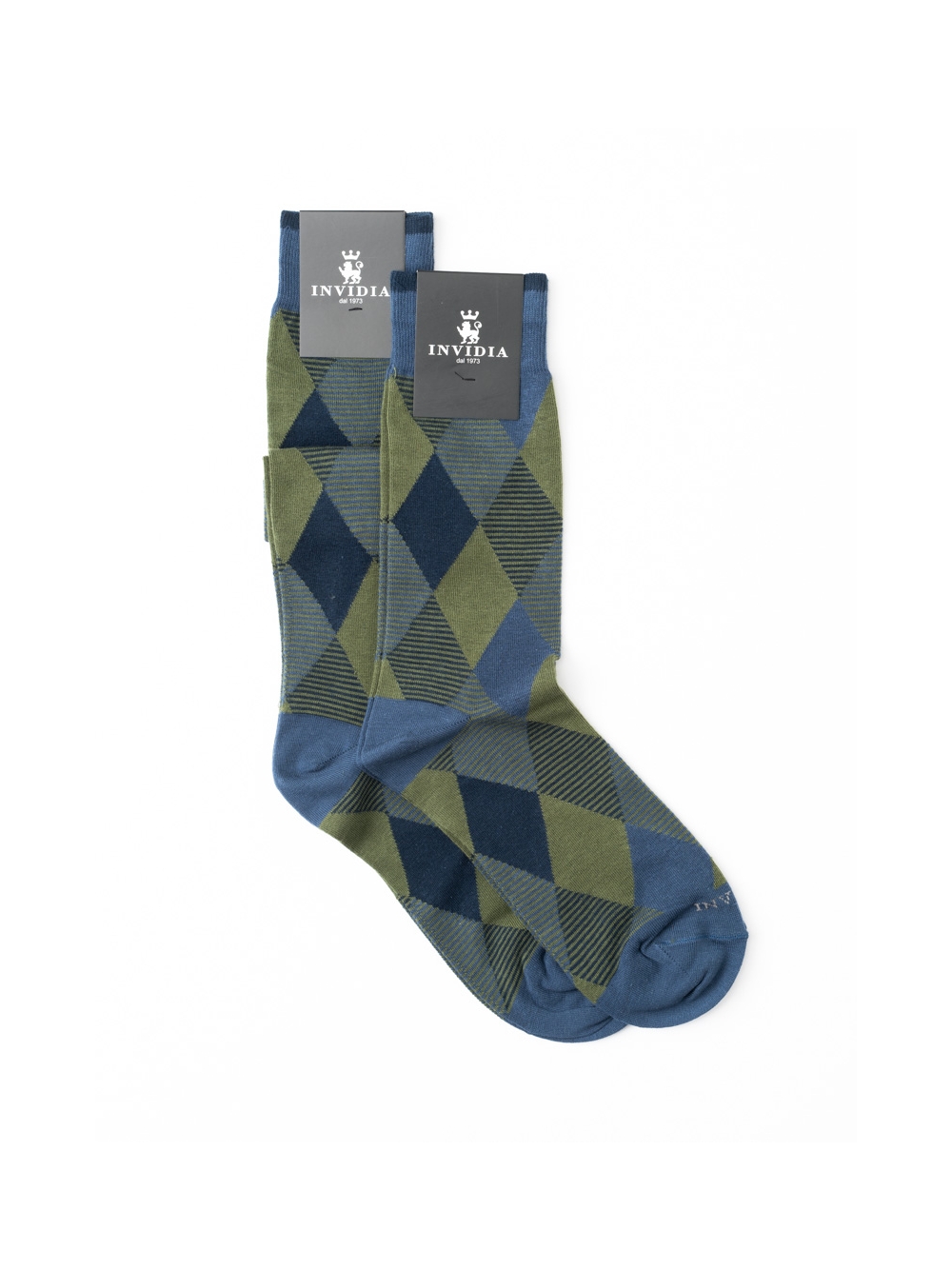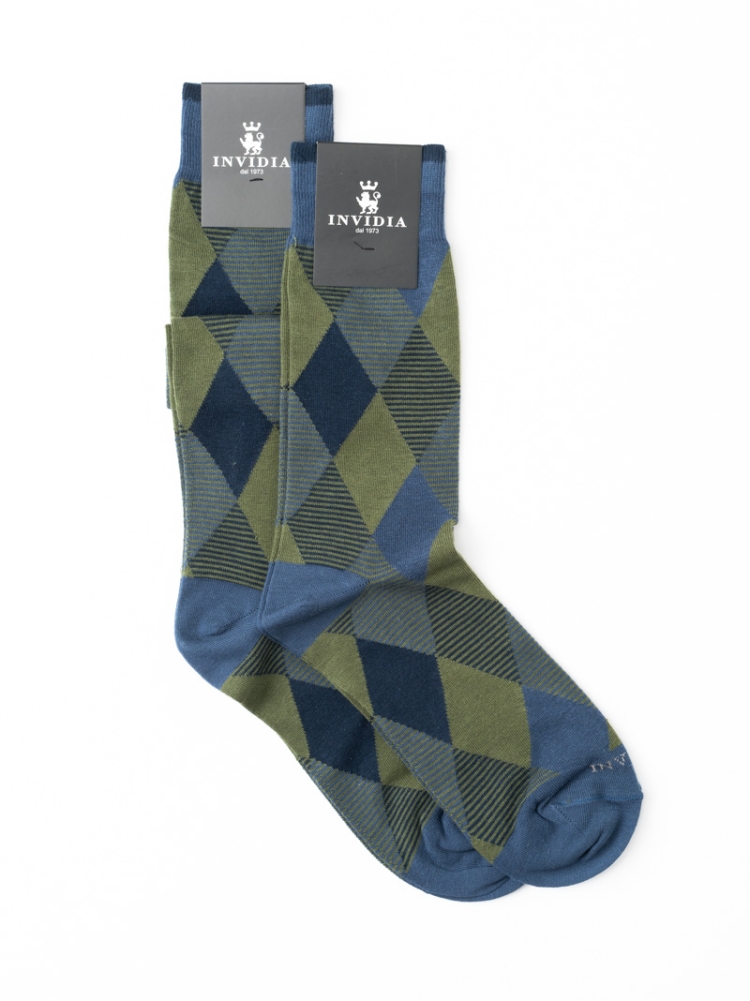 Calza uomo con fantasia geometrica a rombi e righe in due varianti colore, disponibile nella versione corta e lunga.