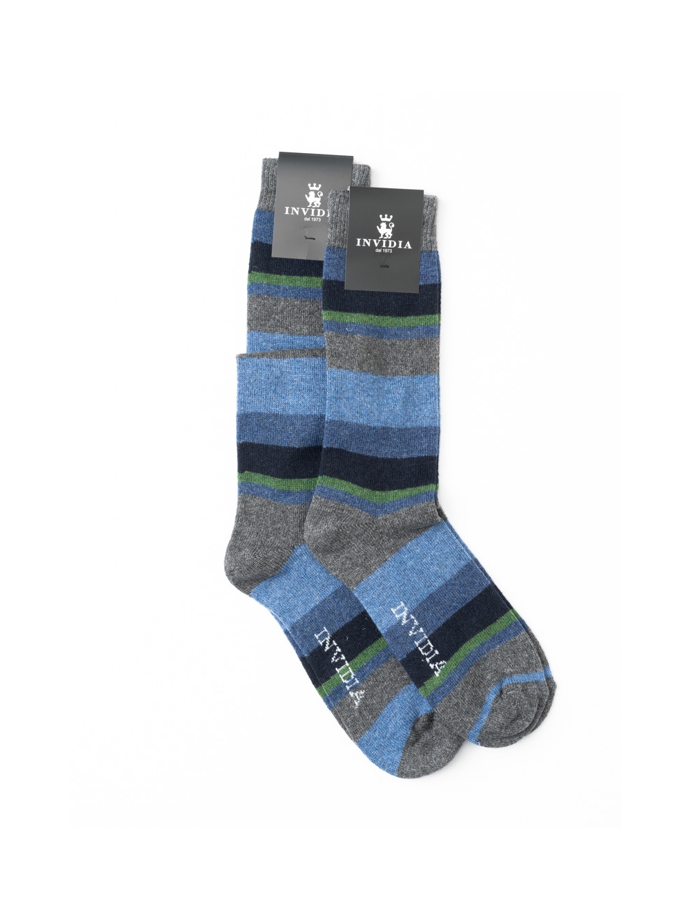 Calza uomo realizzata in caldo tessuto di lana misto cashmere, con fantasia rigatore multicolor nelle varianti grigio-avio-blu militare e grigio-avio, disponibile in due lunghezze, corta e lunga