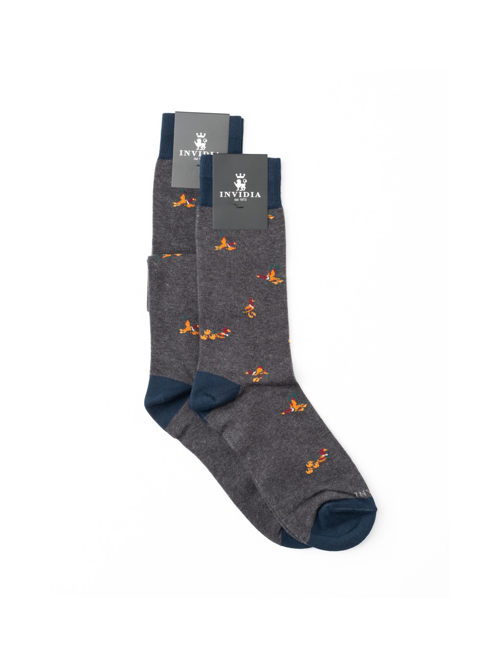 Calza uomo con simpatico disegno dell’anatroccolo in diverse posizioni, su base grigio blu con tallone e balza a contrasto, disponibile in due lunghezze, corta e lunga.