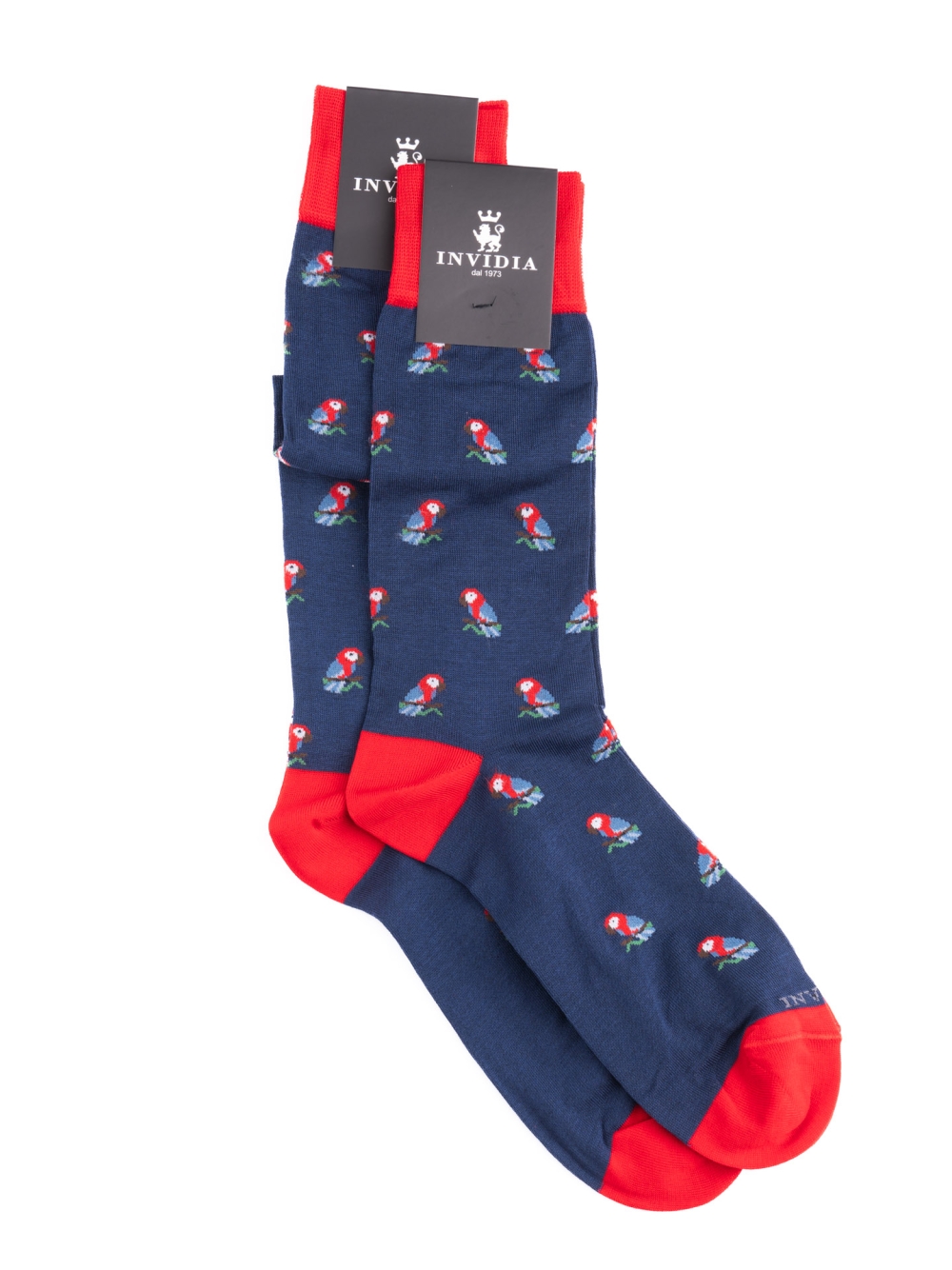 Calza uomo con disegno fantasia pappagallo, disponibile nella versione corta e lunga.