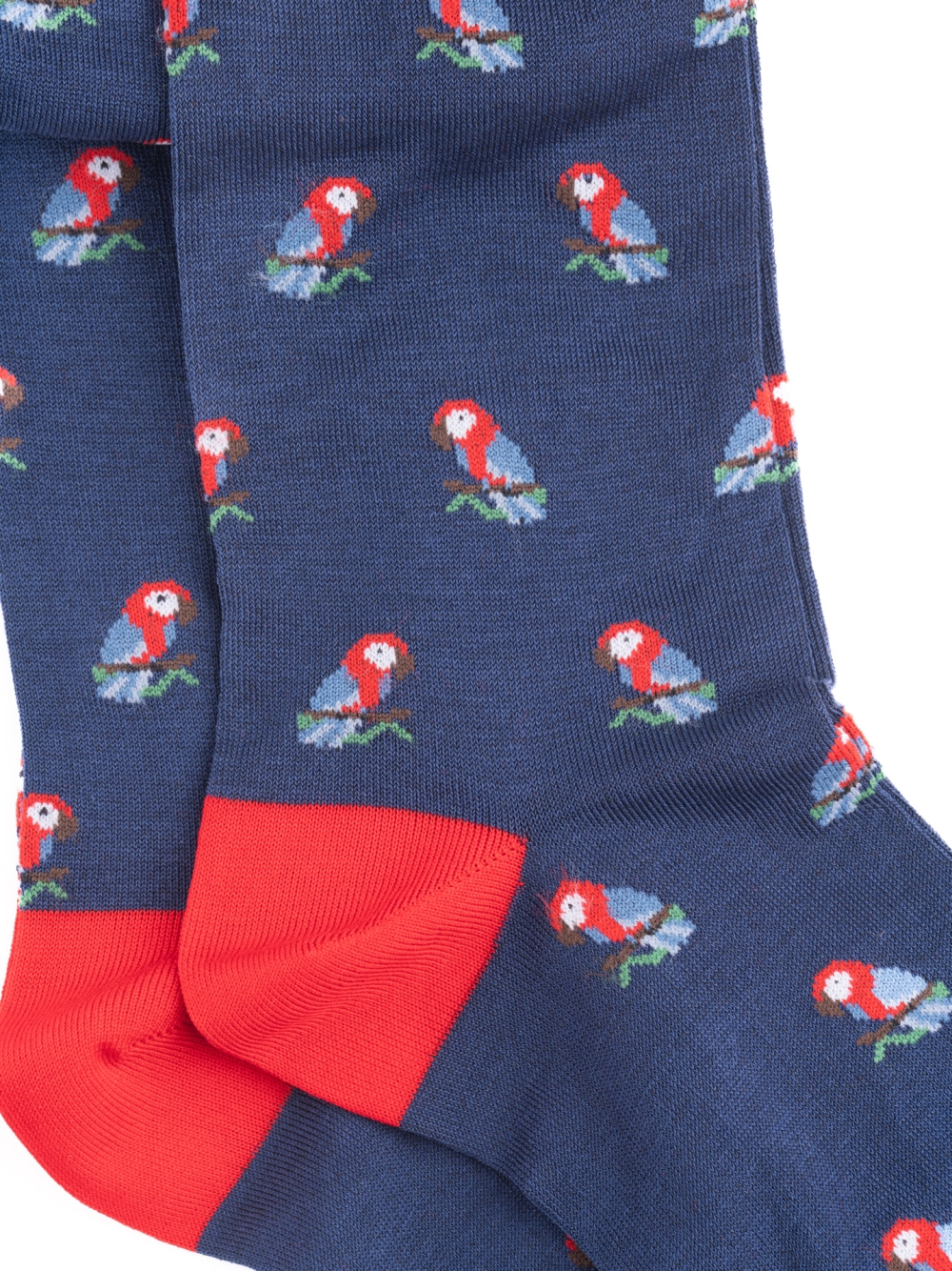 Calza uomo con fantasia a pappagalli colorati disponibile in due lunghezze, corta e lunga, e in due varianti colore: una a base colore blu chiaro con polsini e tallone rosso e una a base colore tortora con polsini e tallone avio.