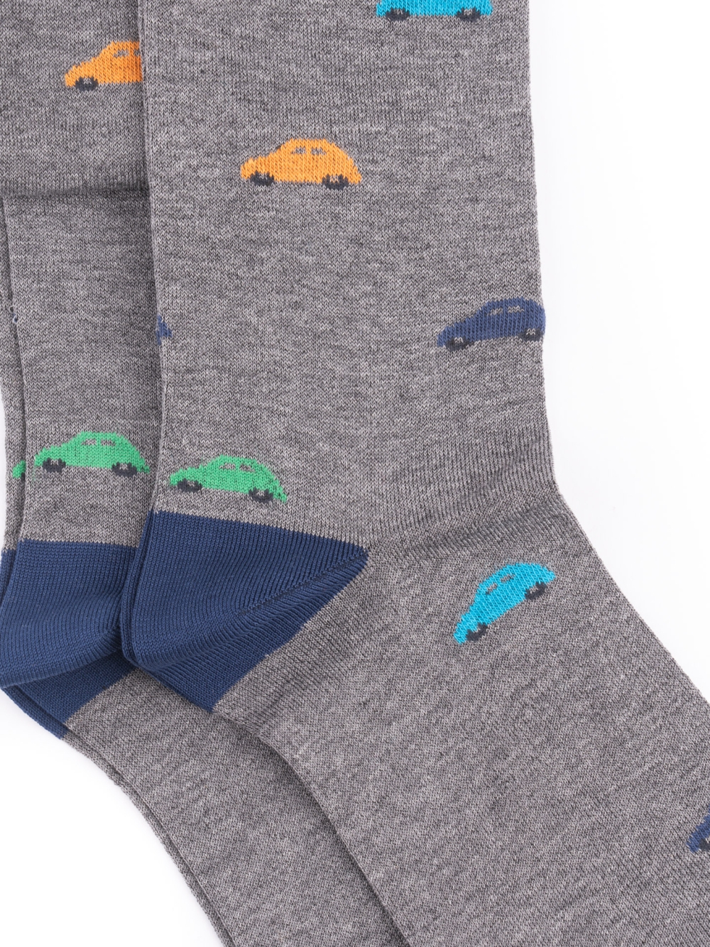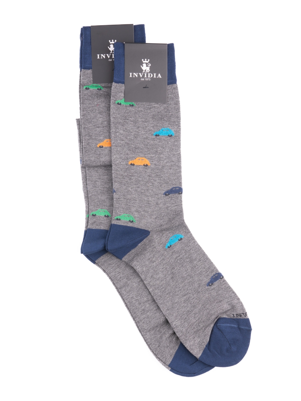 Calza uomo con fantasia a macchinine colorate disponibile in due lunghezze, corta e lunga, e in due varianti colore: una a base colore blu con polsini e tallone rossi e una a base colore grigio mélange con polsini e tallone blu chiaro.