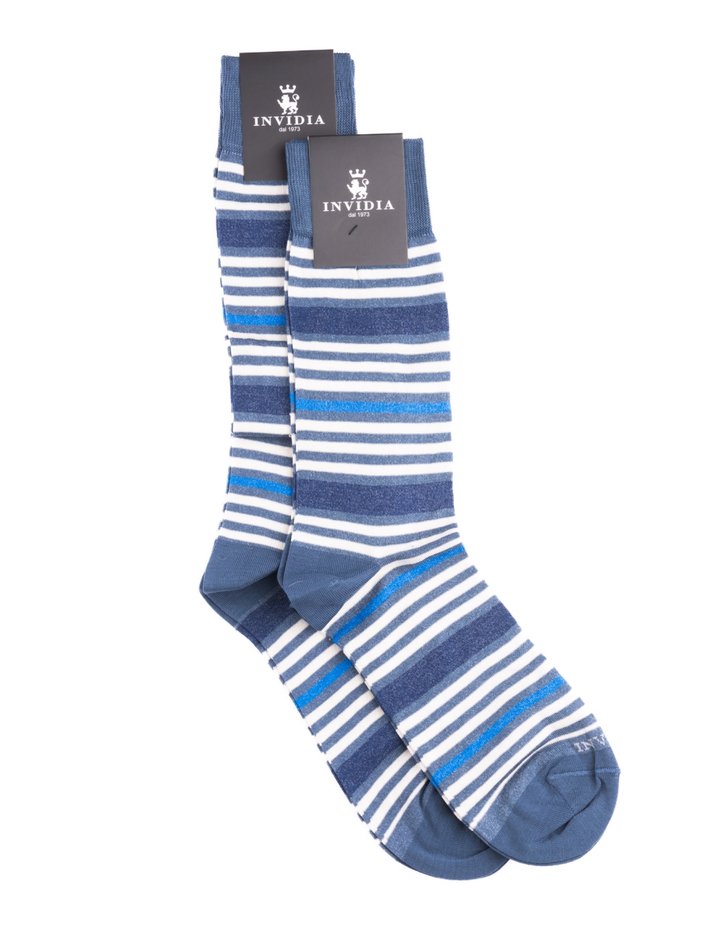 Calza uomo con fantasia rigatore multicolor nelle varianti blu-panna-militare-azzurro e avio-panna-blu-bluette, disponibile in due lunghezze, corta e lunga.