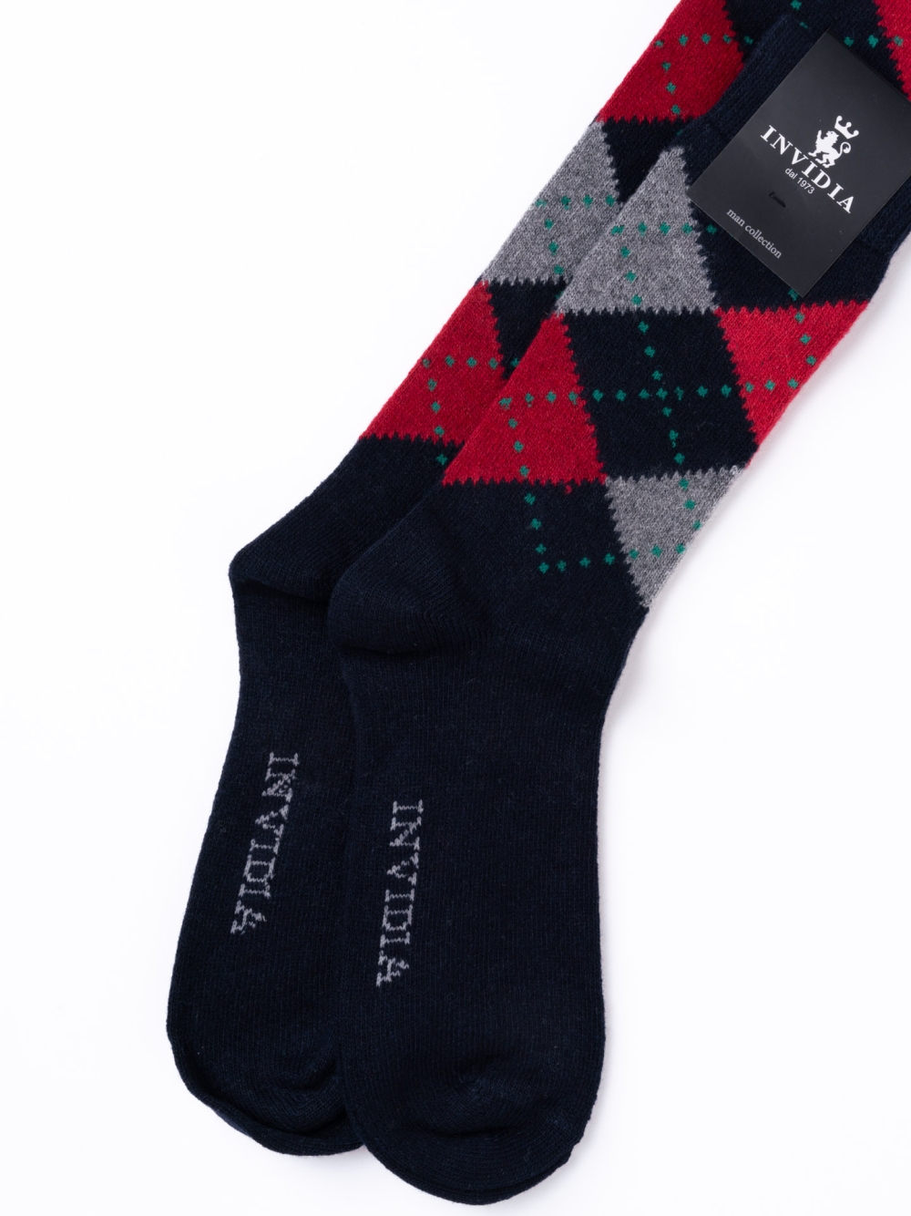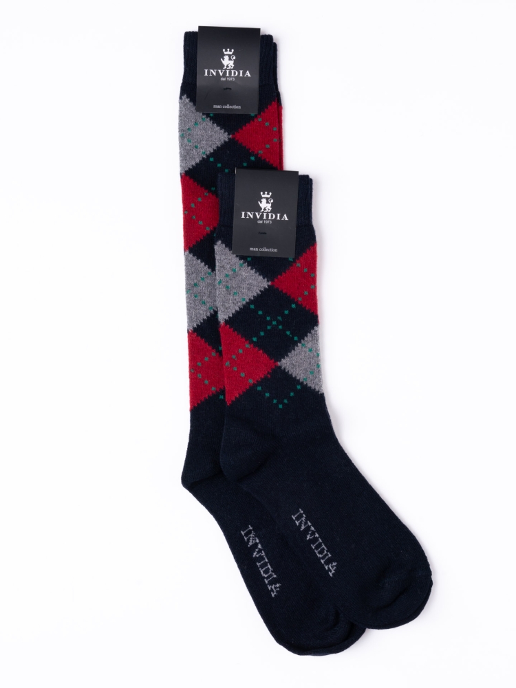 Calza uomo realizzata in 100% lana con fantasia rombo Ballantines nelle varianti colore grigio-rosso-blu-verde acqua e grigio medio-grigio scuro-biscotto-coccio. Disponibile in due lunghezze, corta e lunga.