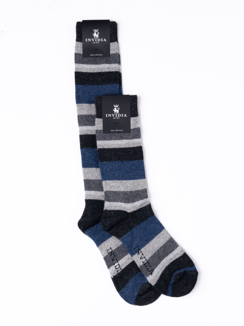 Calza uomo realizzata in 100% lana con fantasia multirighe nelle varianti colore grigio scuro-militare-denim-blu-pistacchio e grigio scuro-grigio medio- grigio chiaro-denim. Disponibile in due lunghezze, corta e lunga.