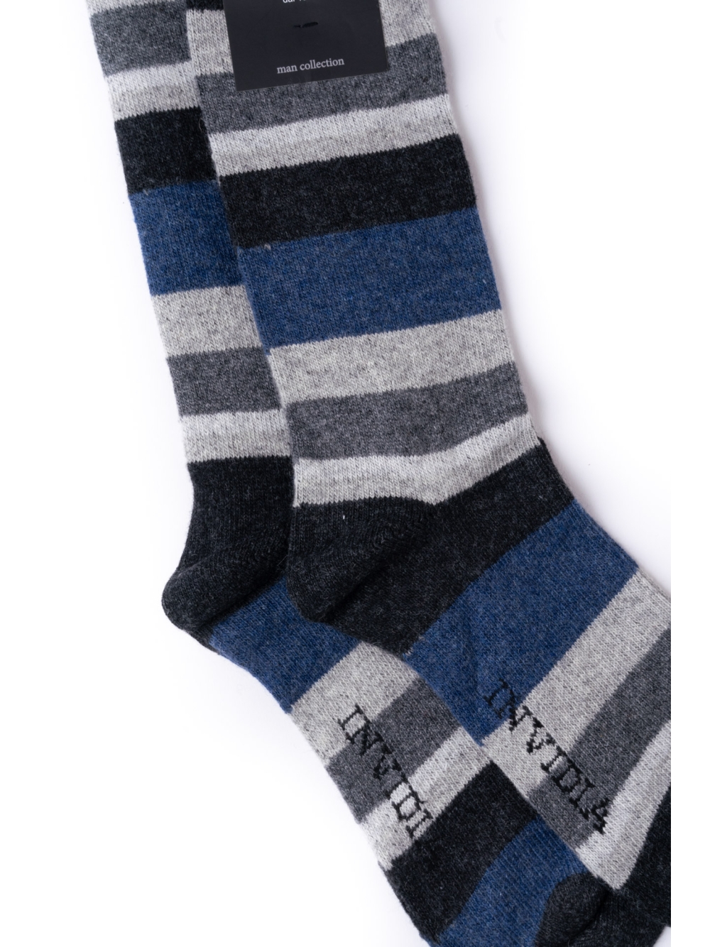 Calza uomo fantasia multirighe realizzata in pura lana.