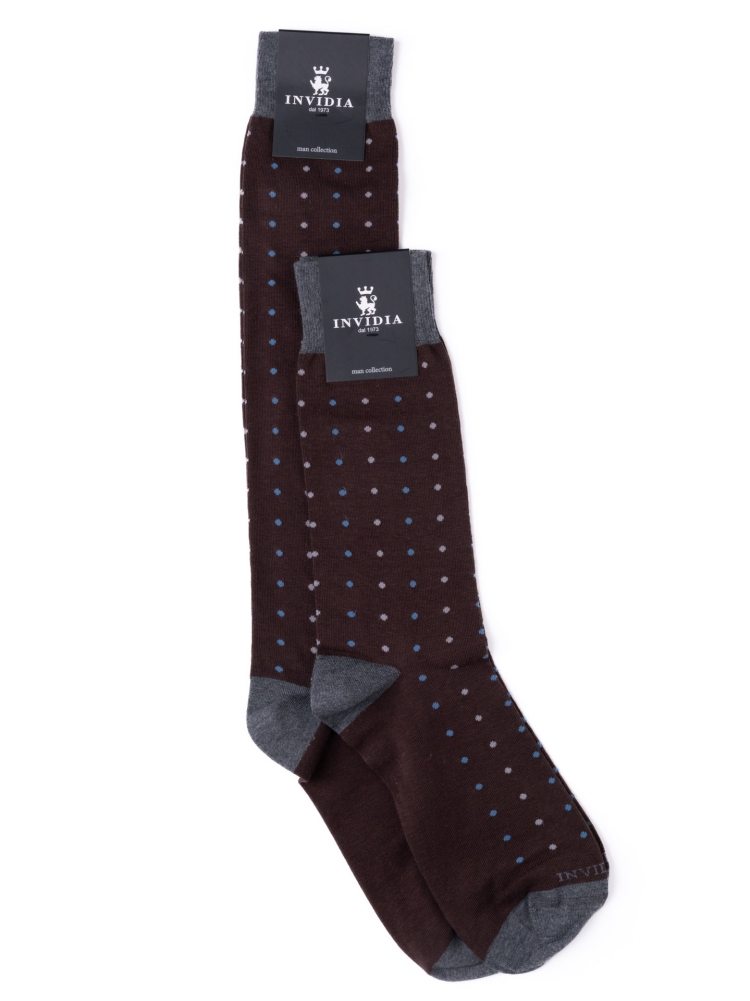 Calza uomo in cotone con pois bicolore, balza, tallone e punta a contrasto, in due varianti colore, blu-rosso-grigio e moro-azzurro-grigio. Disponibile in due lunghezze, corta e lunga.