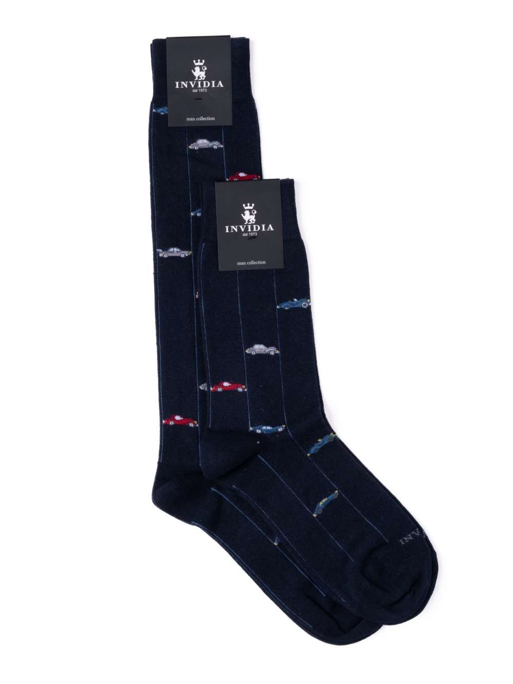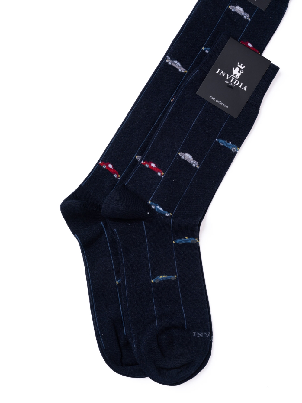 Calza uomo in cotone con disegno macchinina e riga ad intarsio, disponibile nella colorazione blu-rosso-bluette-grigio e in due lunghezze, corta e lunga.