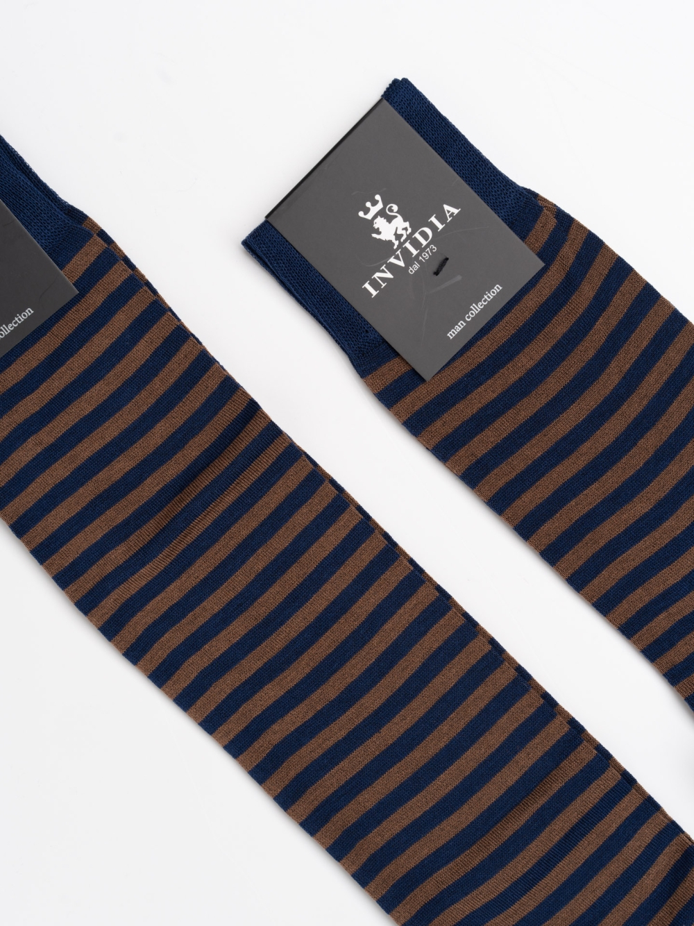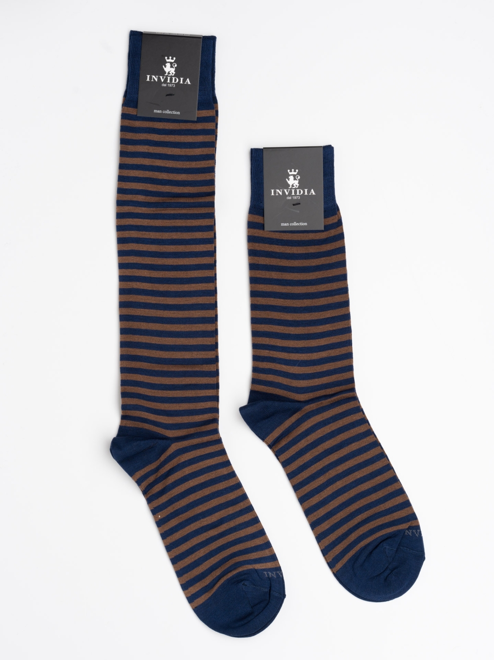 Calza uomo dal design classico a righe pari multicolore, con tallone, punta e balza in tinta unita per un contrasto elegante e versatile.