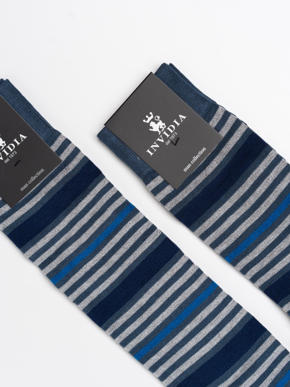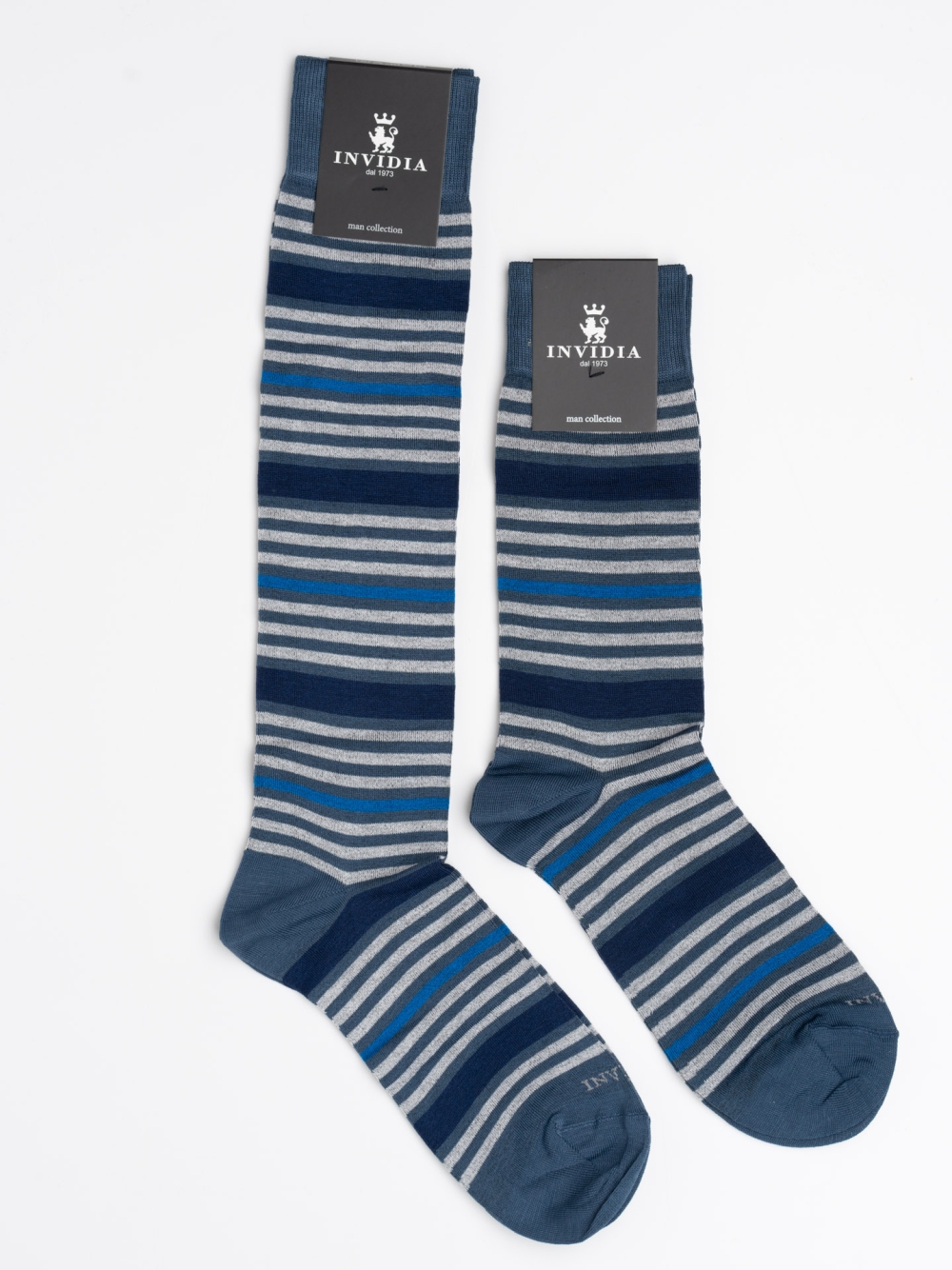 Uno storico modello Invidia 1973, questa calza presenta righe spaziate multicolor con balza, punta e tacco a tinta unita per un contrasto elegante.
