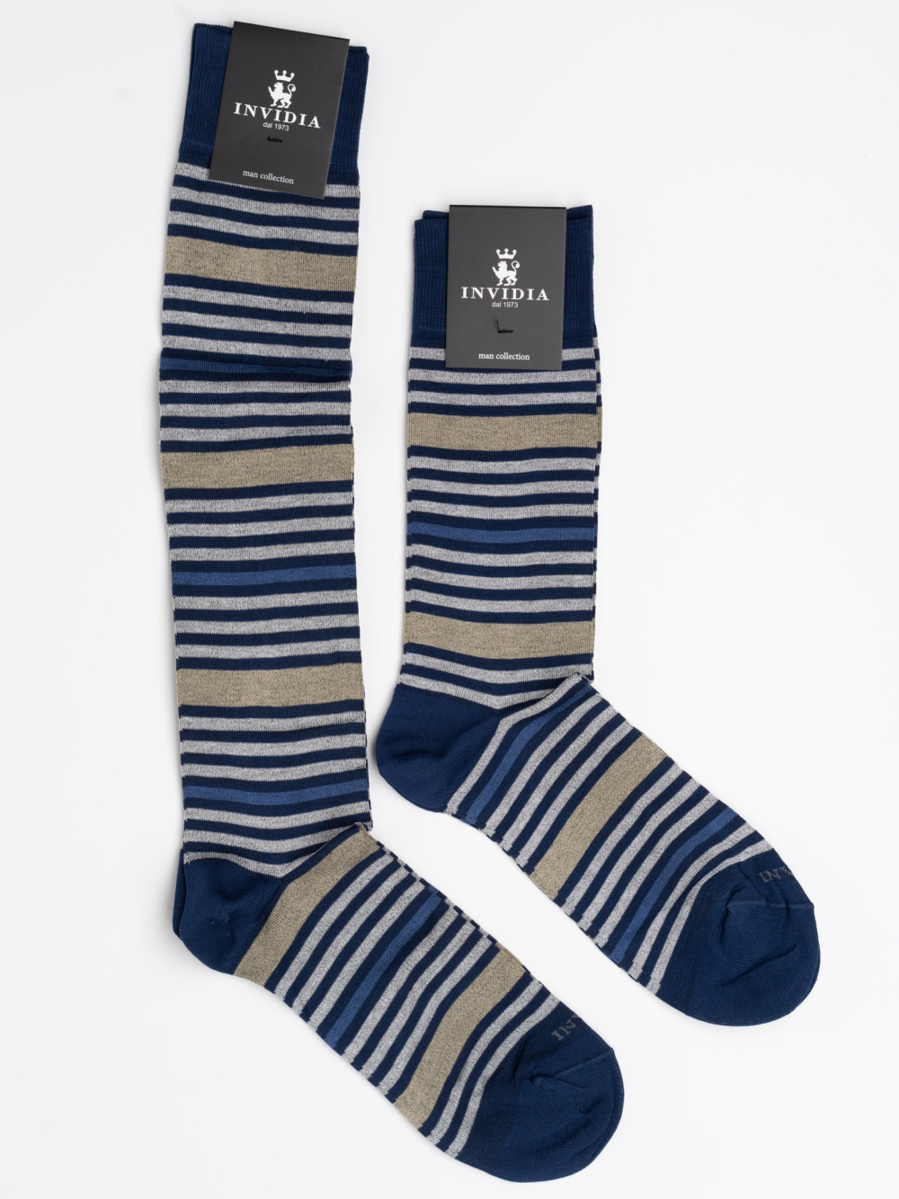 Uno storico modello Invidia 1973, questa calza presenta righe spaziate multicolor con balza, punta e tacco a tinta unita per un contrasto elegante.