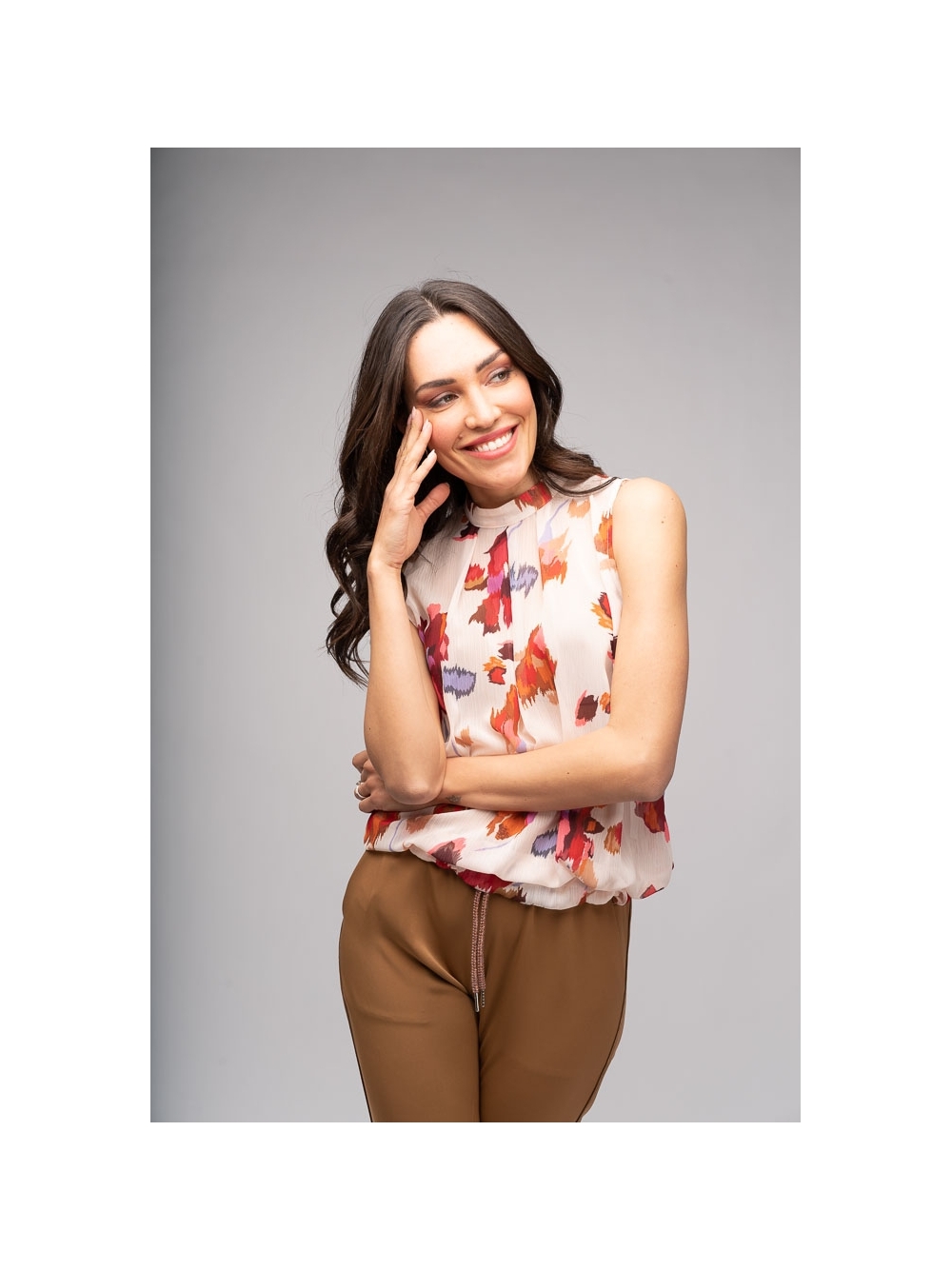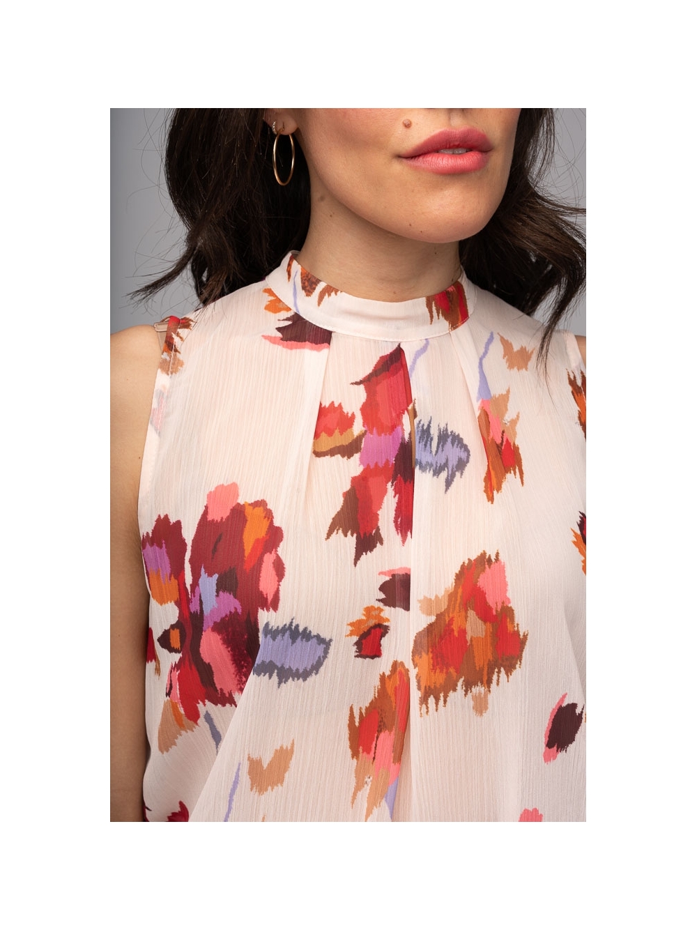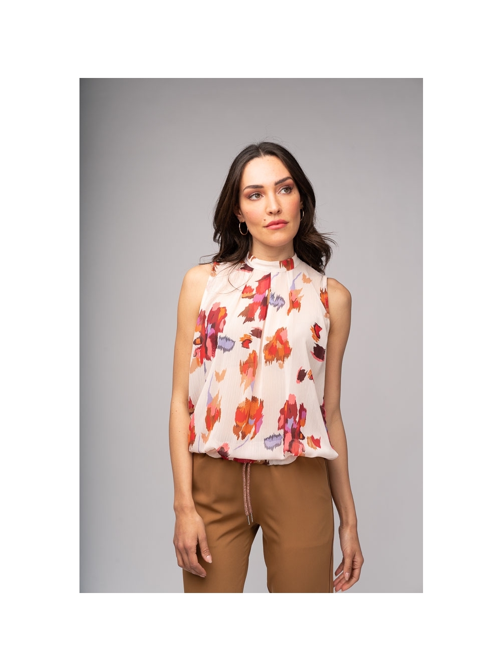 Blusa donna senza maniche in georgette stampata Collo con chiusura ad oblò con bottone sulla schiena ed elastico in vita, un capo dal mood decisamente femminile e romantico
