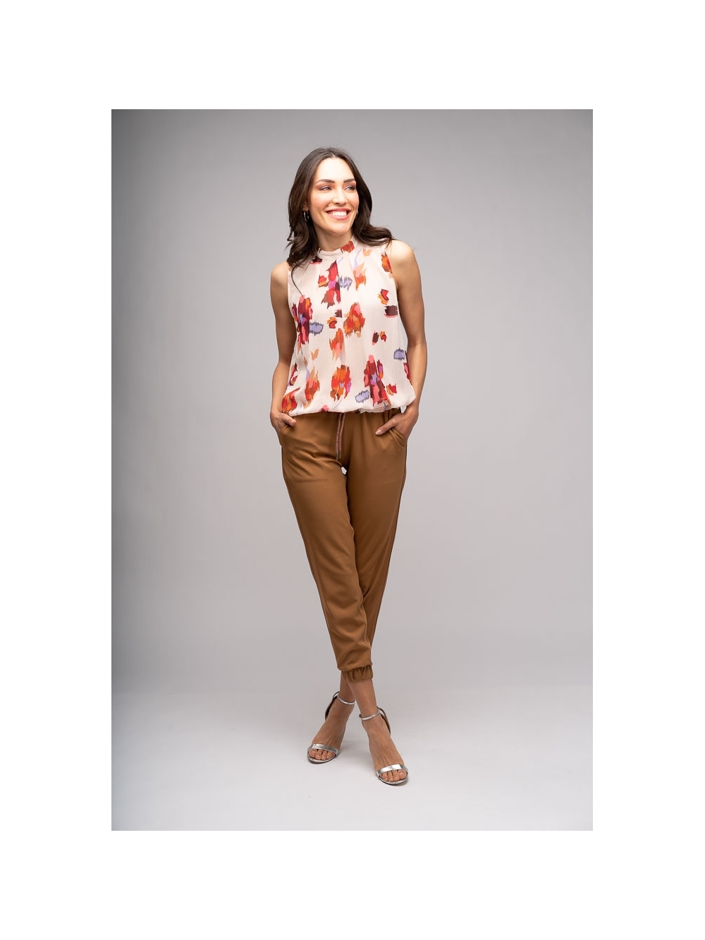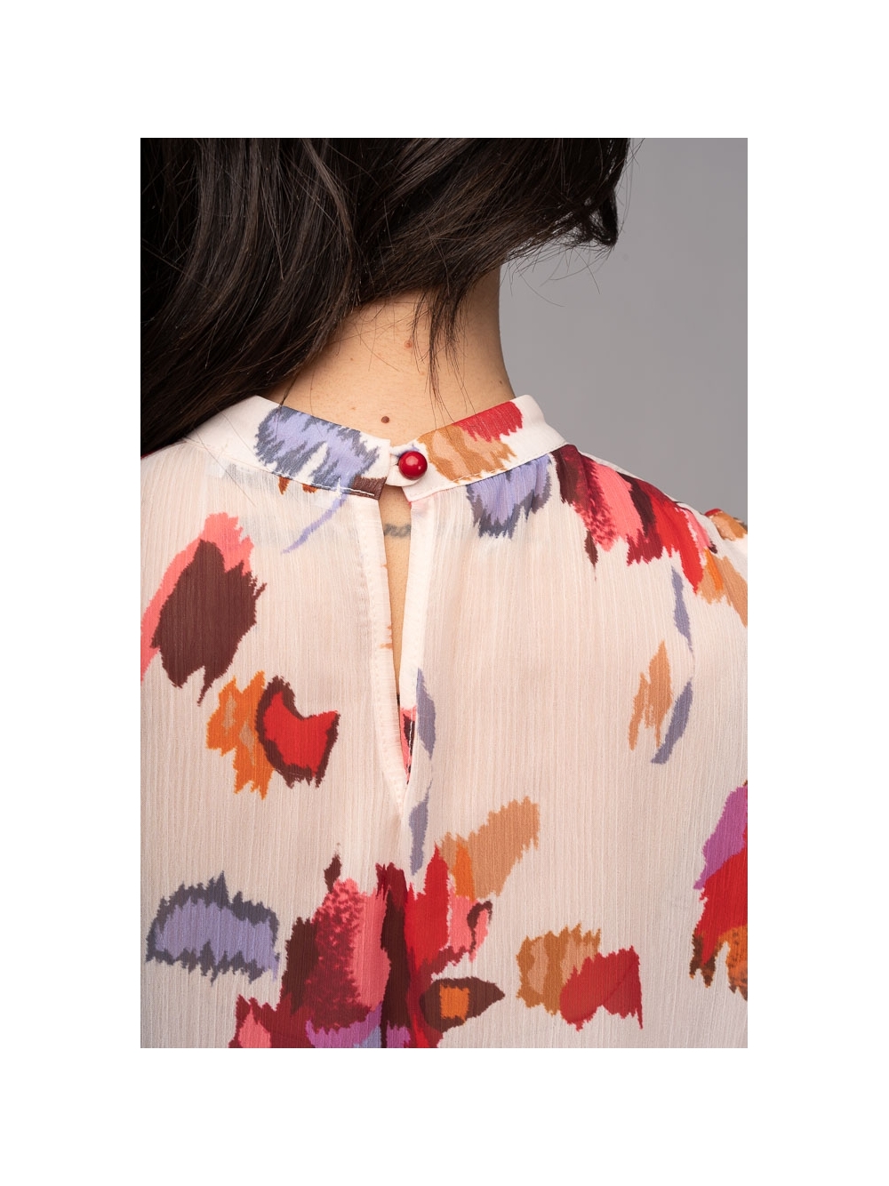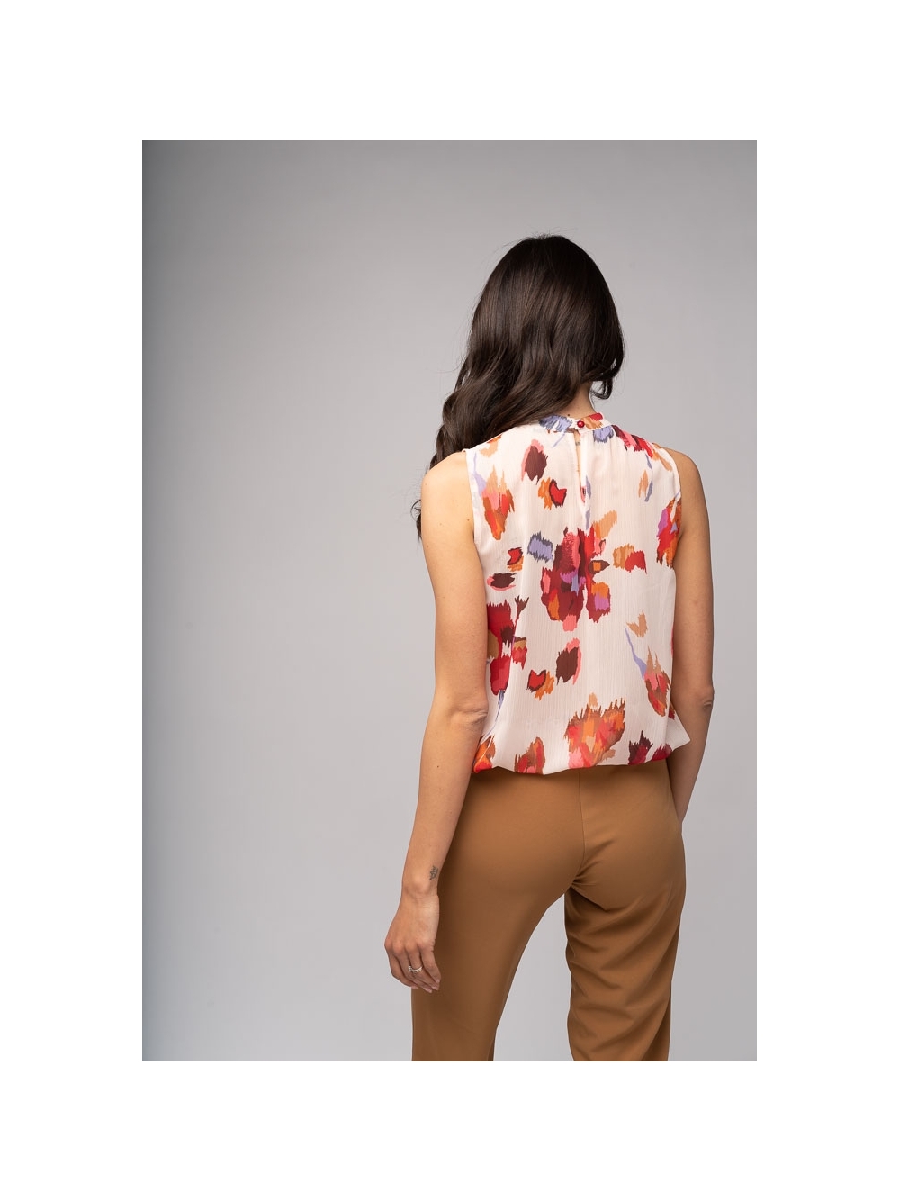 Blusa donna senza maniche in georgette stampata Collo con chiusura ad oblò con bottone sulla schiena ed elastico in vita, un capo dal mood decisamente femminile e romantico