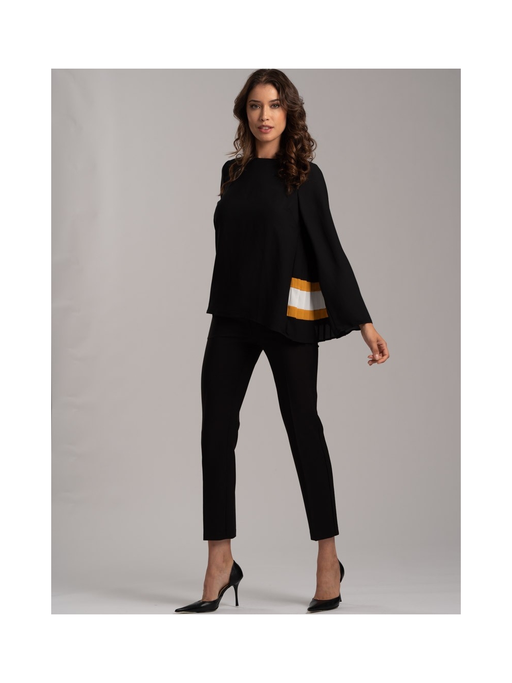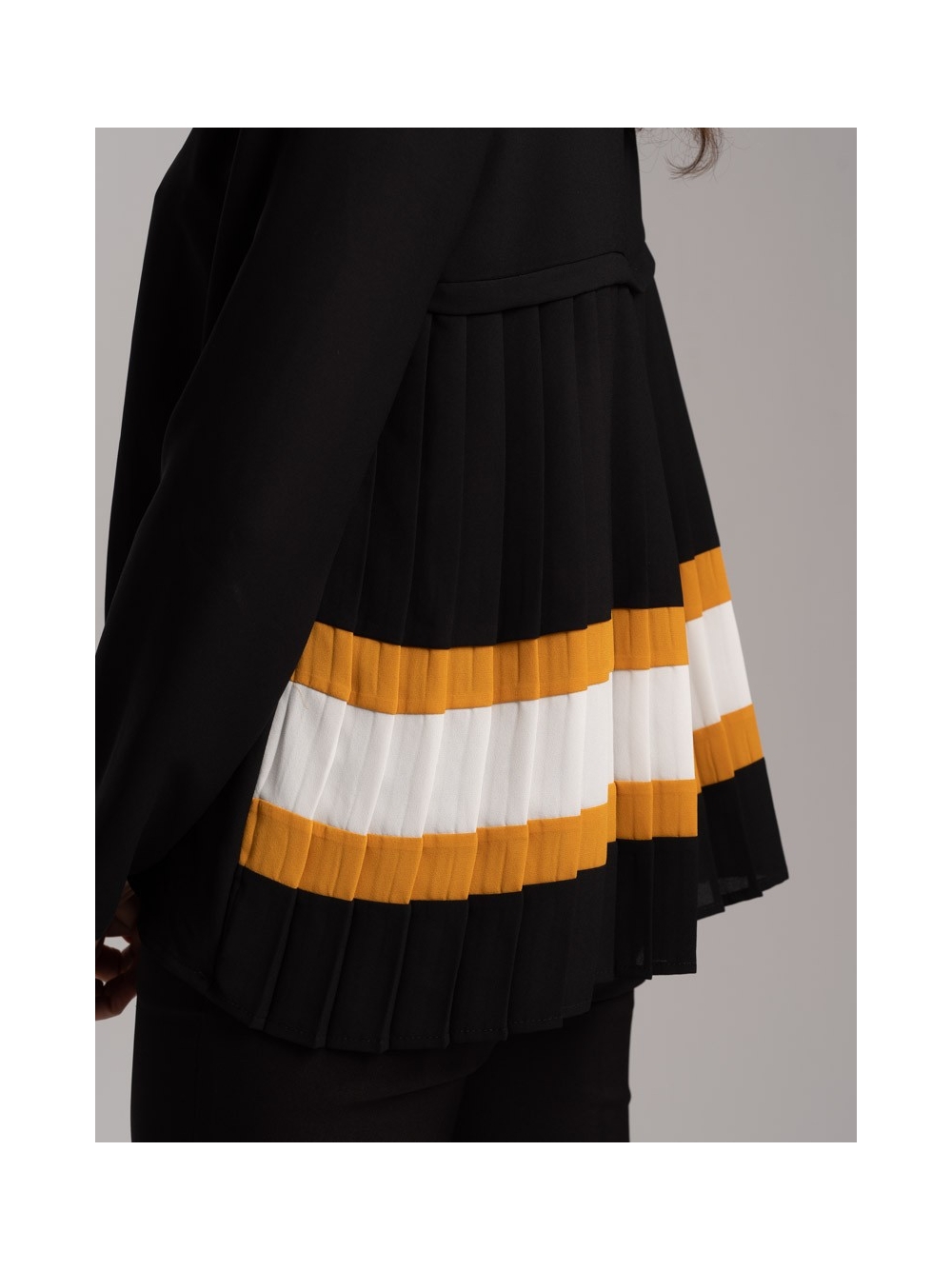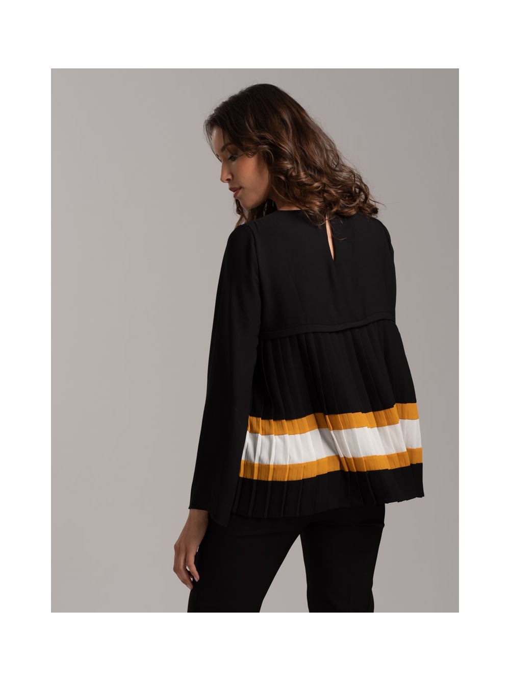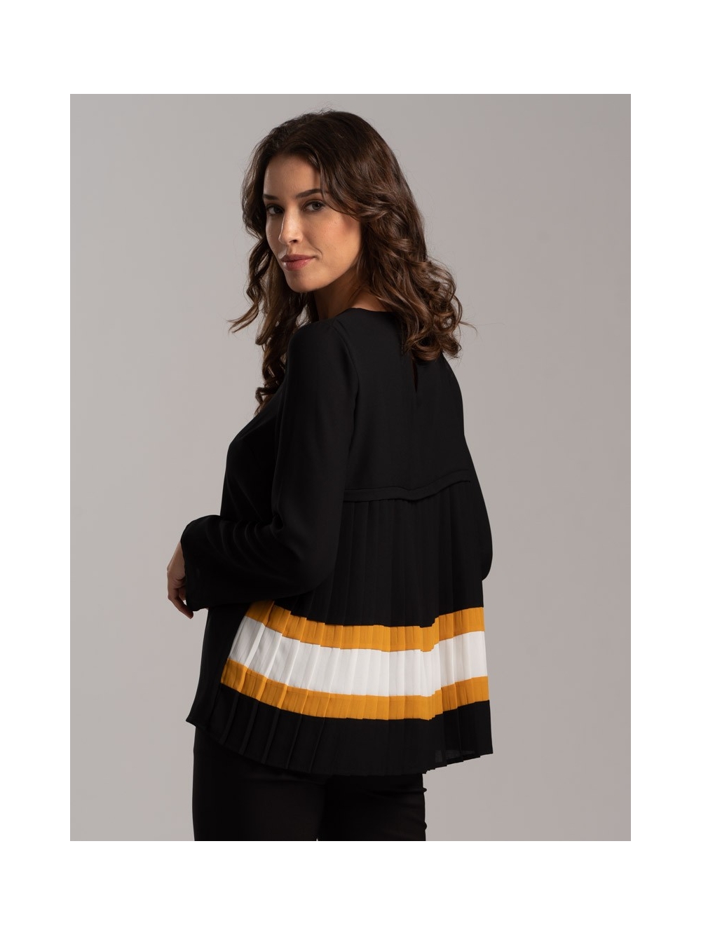 Camicia donna in Georgette, vestibilità fluida con dietro plissettato e con balza a contrasto a 2 colori.