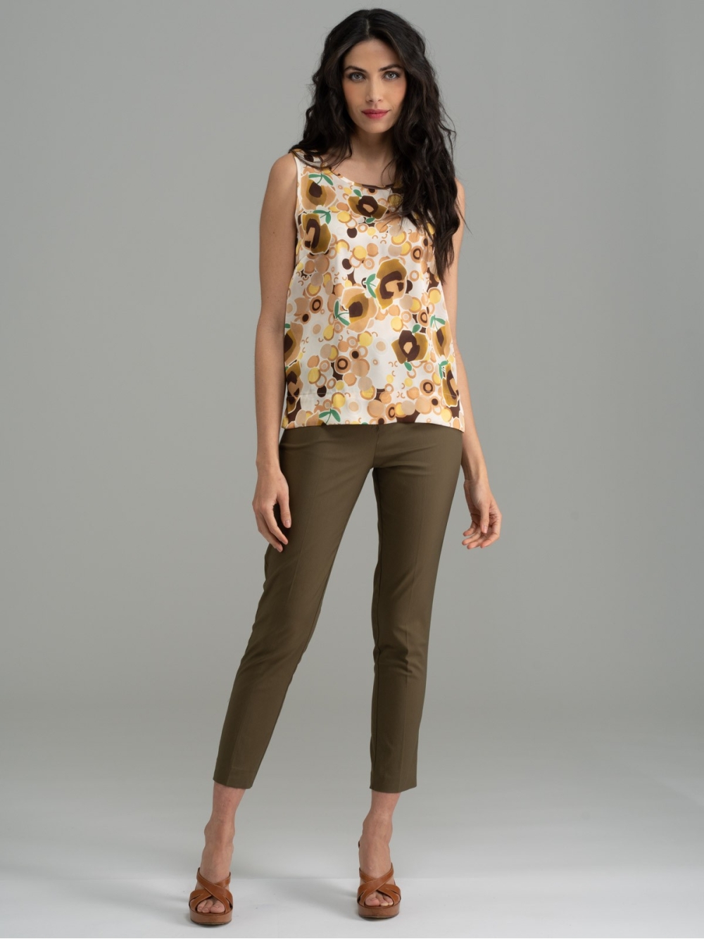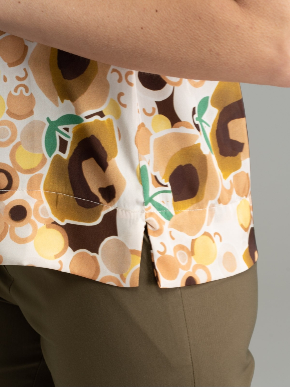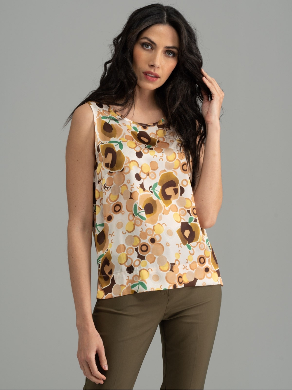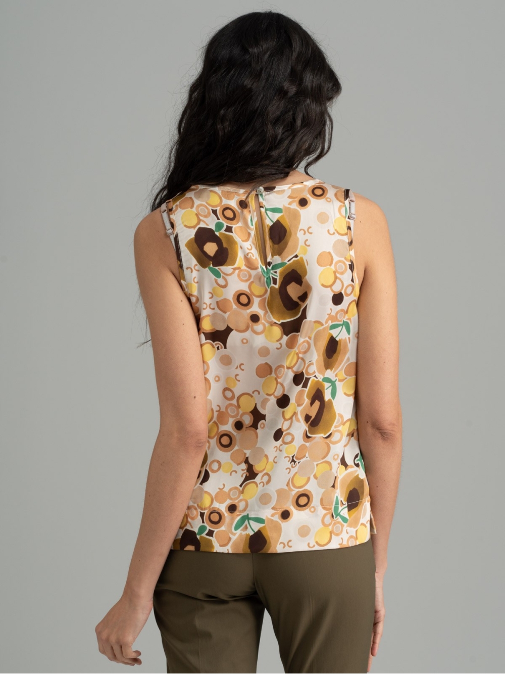 Camicia donna smanicata a girocollo, realizzata in tessuto satin stampato con fantasia esclusiva INVIDIA 1973, nei toni del verde, giallo e bianco, su base oliva e sabbia, caratterizzata da chiusura posteriore con occhiello e bottoncino e piccoli spacchi sui fianchi.