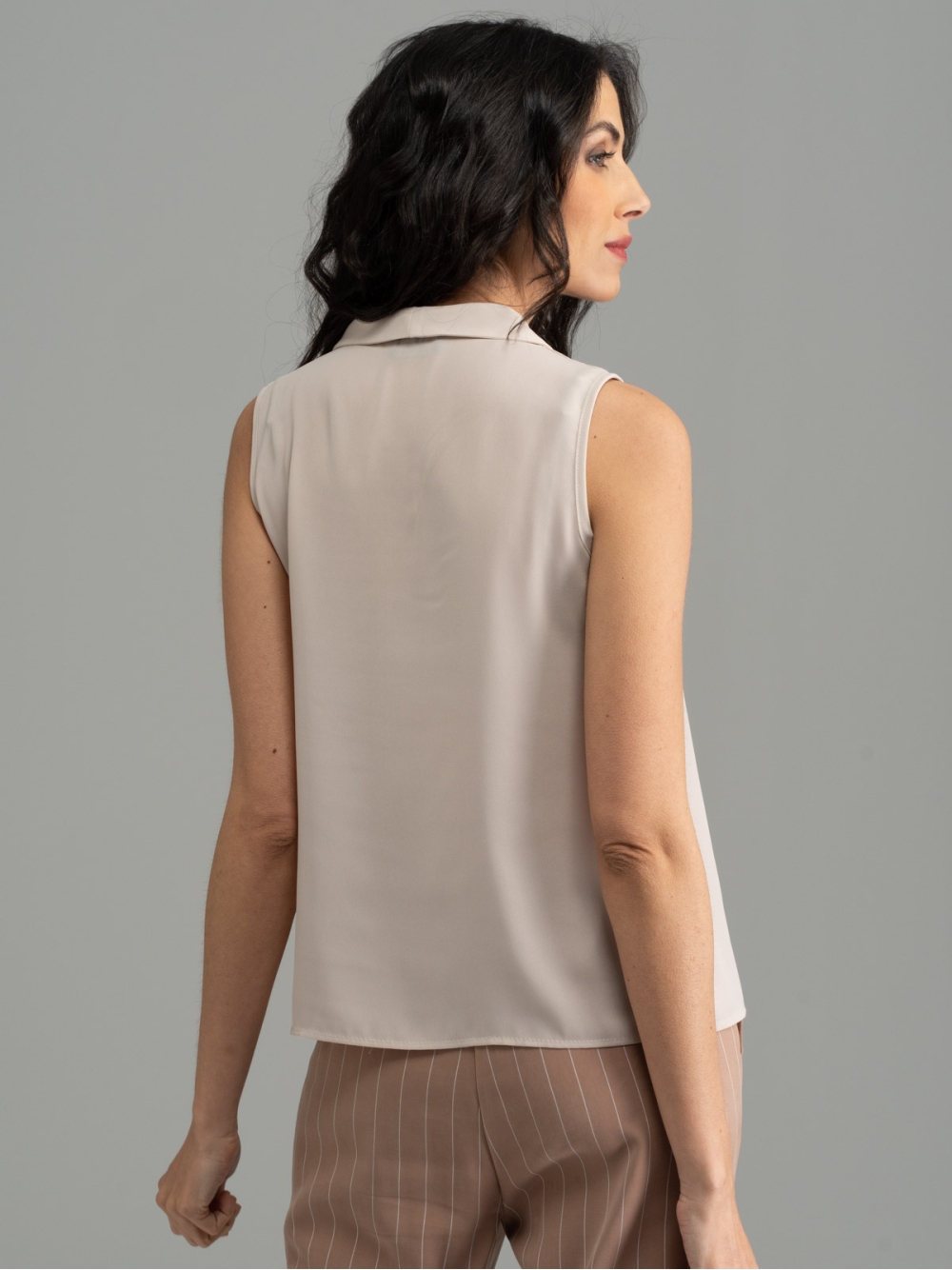 Camicia donna smanicata realizzata in tessuto Georgette a tinta unita – nelle varianti nero e sabbia – con reverse sul collo stile giacca, che incorniciano il decoltè con eleganza
