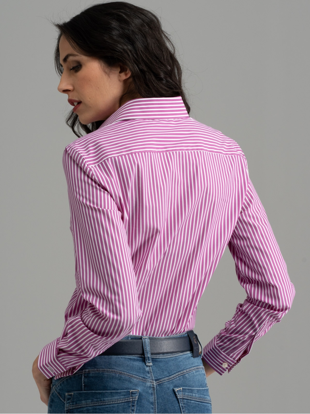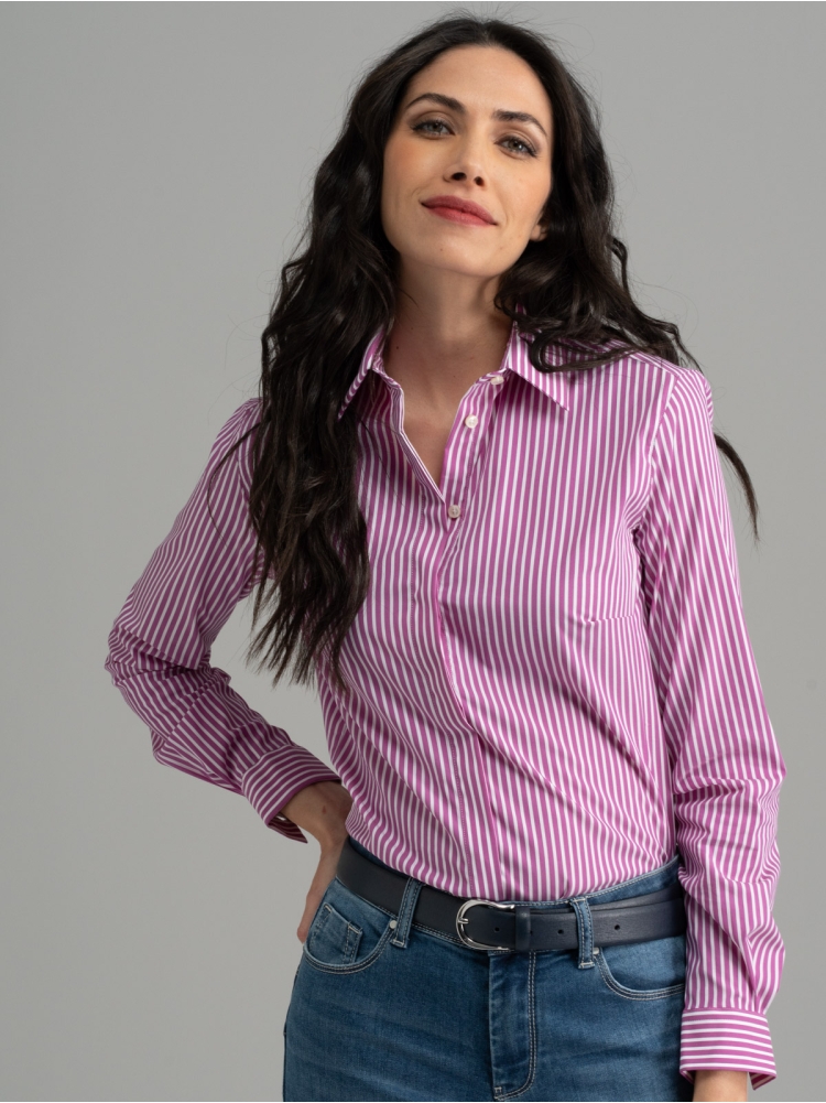 Camicia donna a righe vestibilità classica con pinces e canolo davanti con abbottonatura nascosta. Realizzata in tessuto in cotone popeline a righe stretch.
