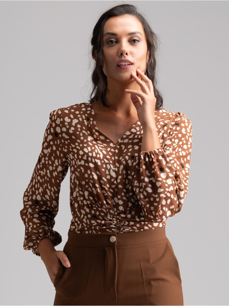 Camicia donna realizzata in georgette con stampa fantasia, scollo a V, manica a sbuffo e coulisse in vita.