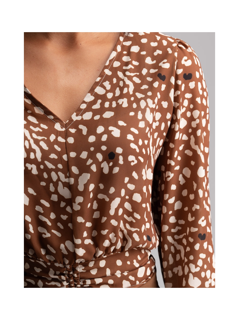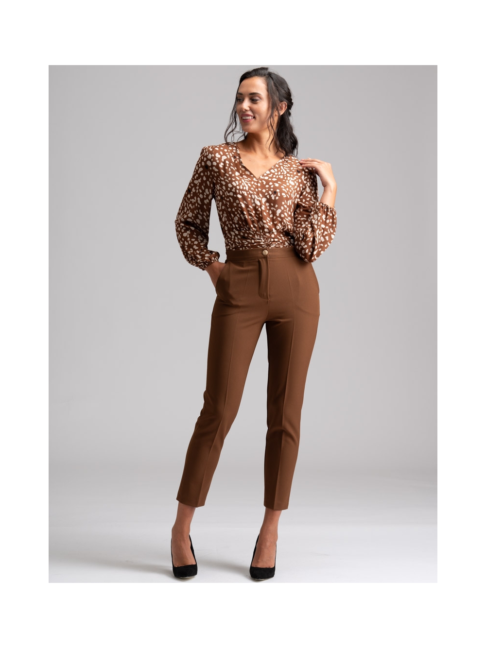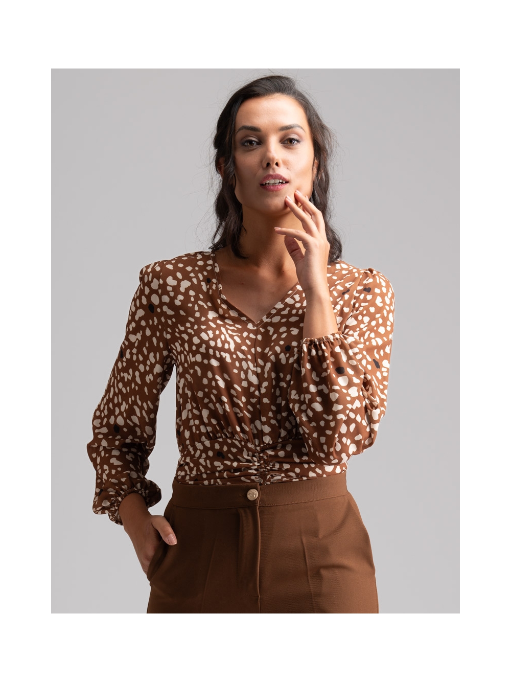 Camicia donna con manica lunga a sbuffo, scollo a V e coulisse in vita realizzata in georgette con stampa fantasia esclusiva INVIDIA 1973. Le tonalità della camicia donna di sposano perfettamente con quelle degli altri pezzi della collezione autunno inverno, così da creare abbinamenti coordinati e ricercati.