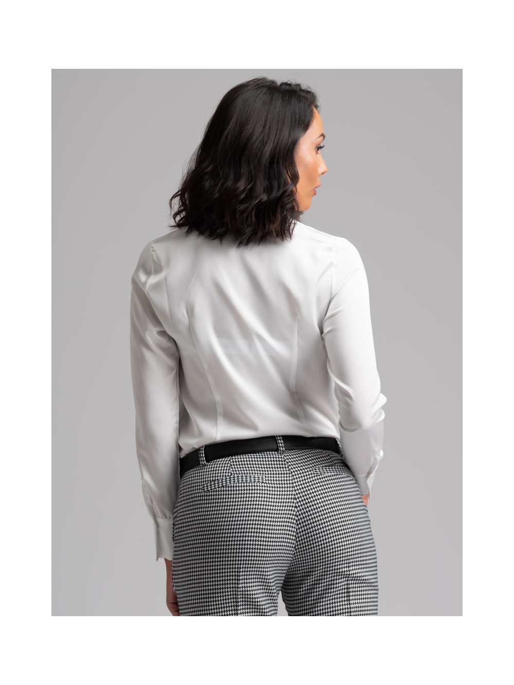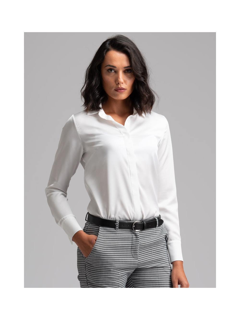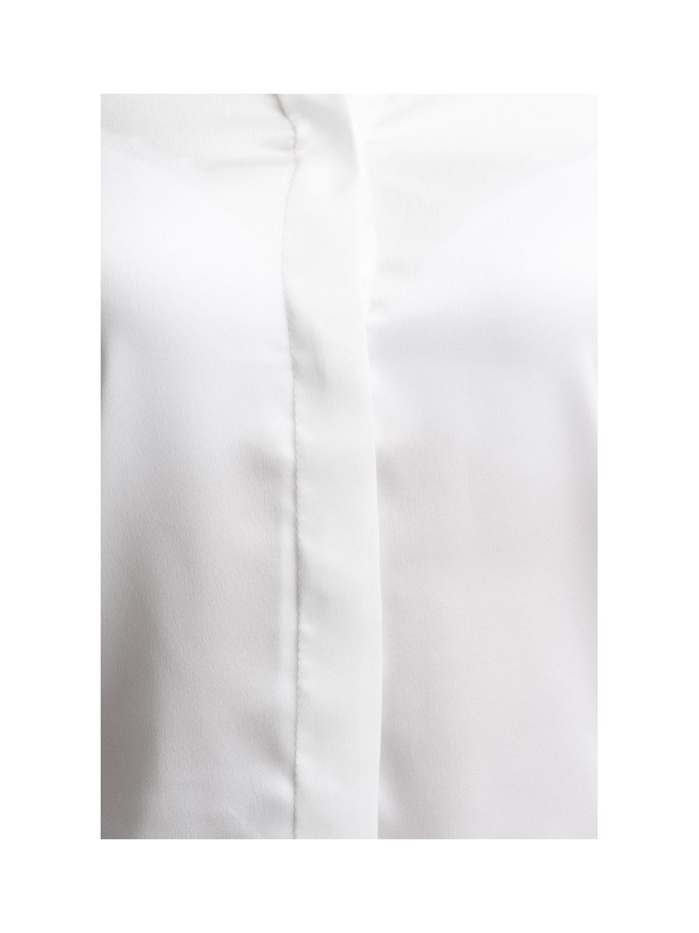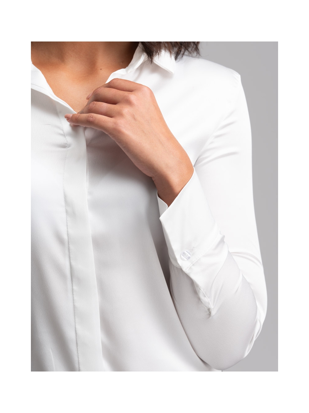 Camicia donna classica a manica lunga realizzata in satin tinta unita con abbottonatura coperta e pinces sul retro e all’altezza seno.