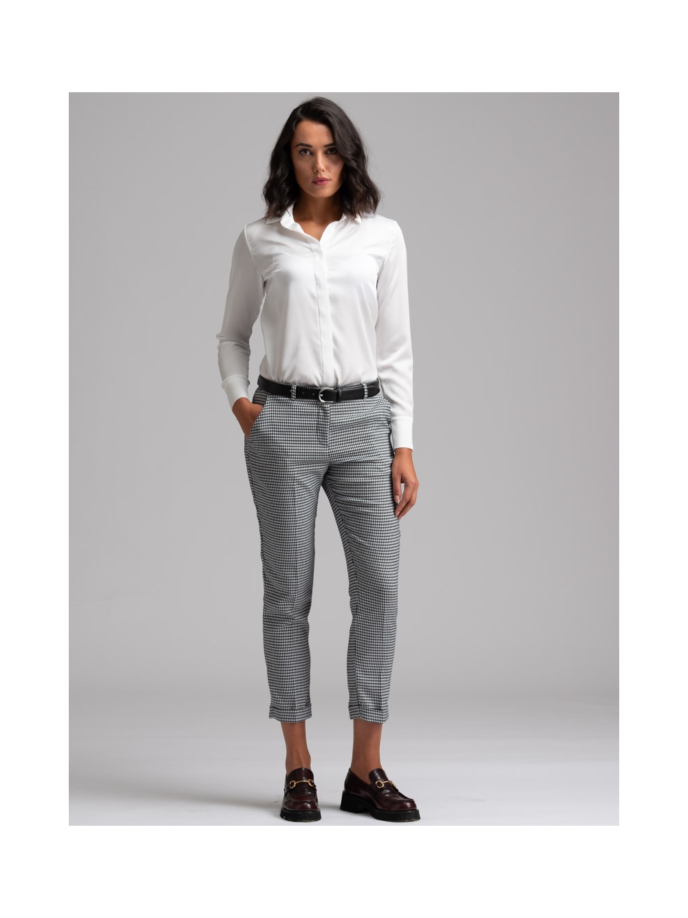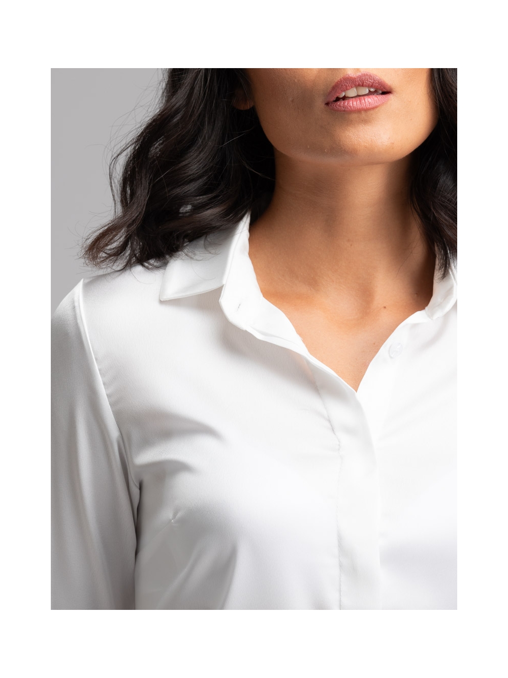Camicia donna a manica lunga dalla vestibilità classica realizzata in satin tinta unita con abbottonatura coperta e pinces sul retro e all’altezza seno per accentuare la silhouette e donare femminilità. Questa camicia è disponibile nella variante colore bianco e nel color sabbia.